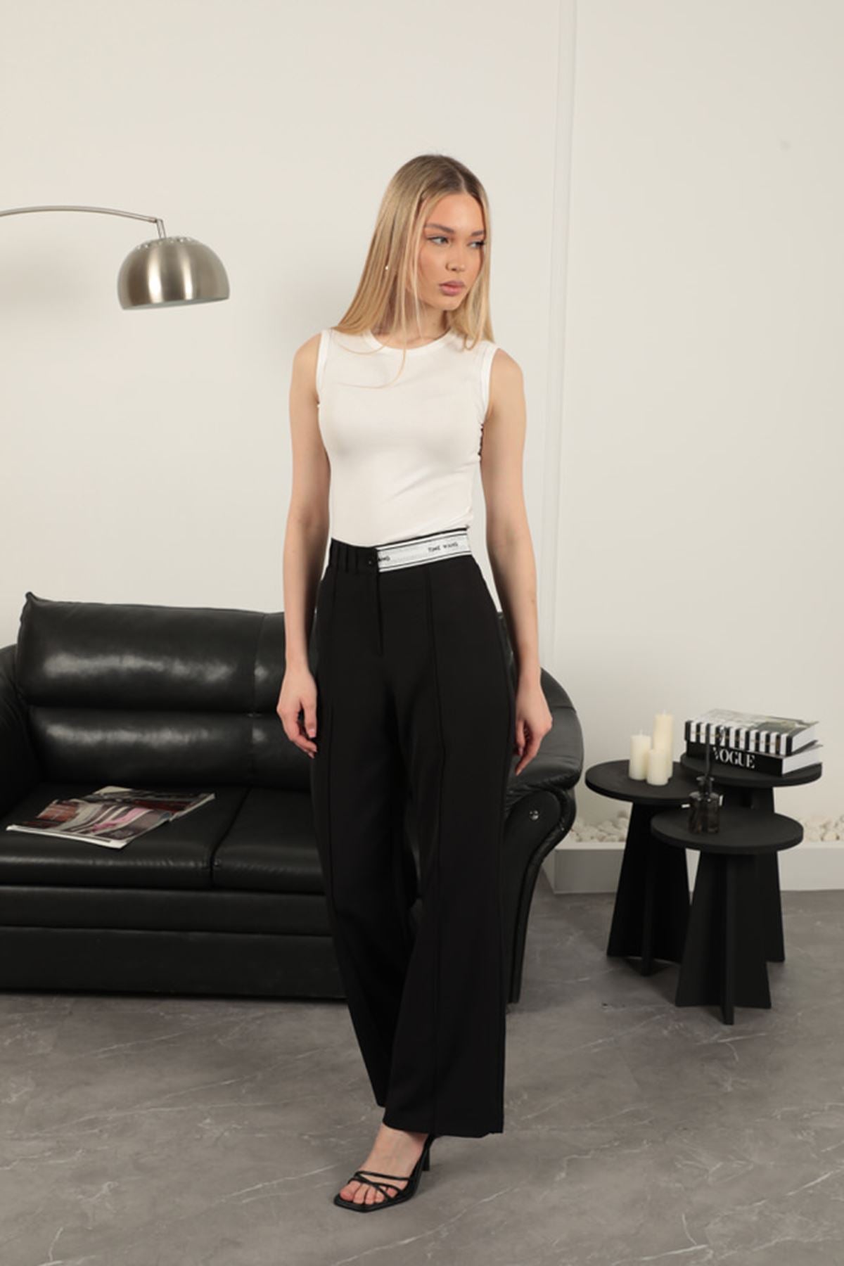 Atlas Kumaş Kemeri Taş Detaylı Pantolon-Siyah