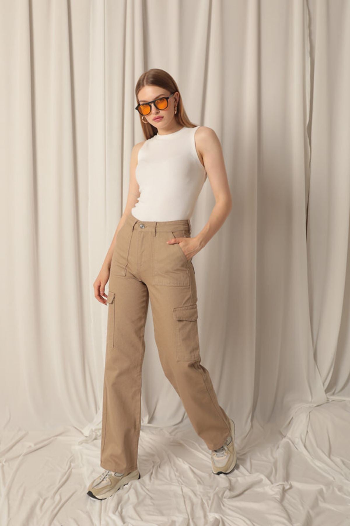 Denim Kumaş Kargo Cepli Kadın Bej Pantolon
