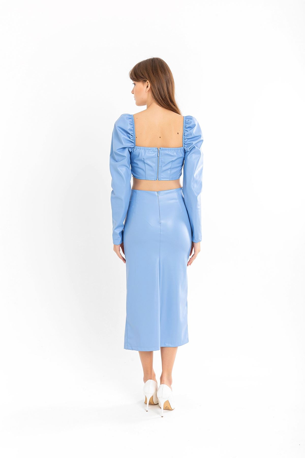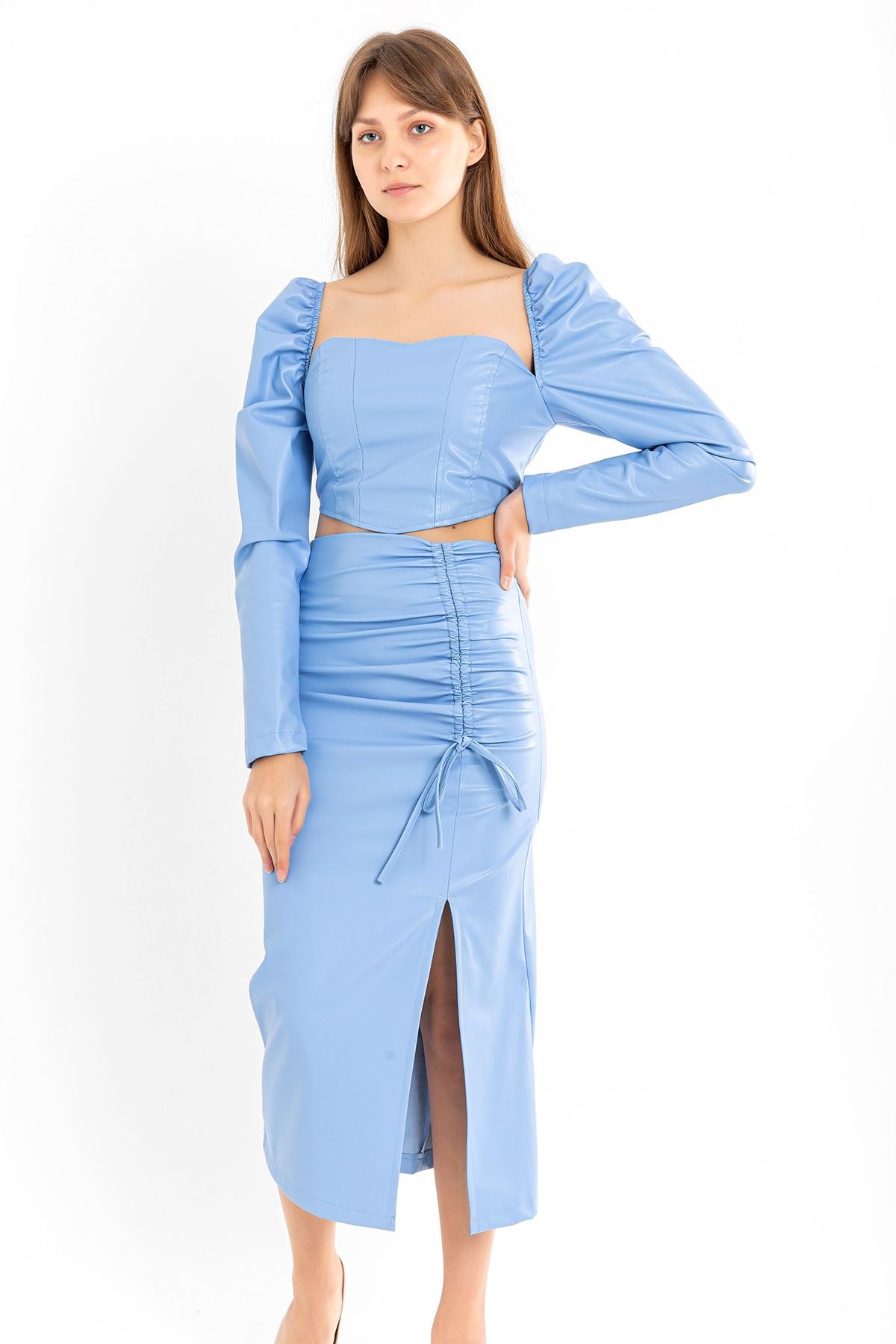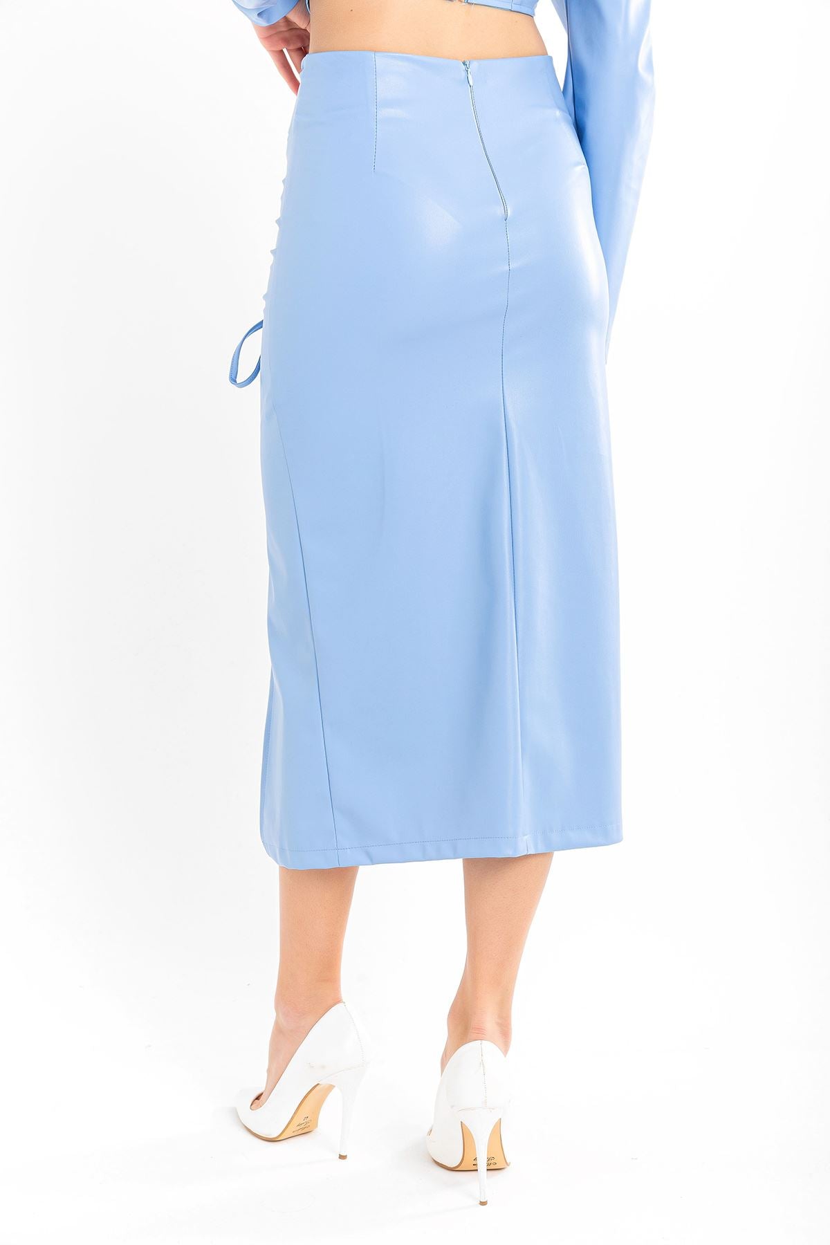 Deri Kumaş Diz Altı Boy Yırtmaçlı Büzgü Detaylı Kadın Etek-Mavi