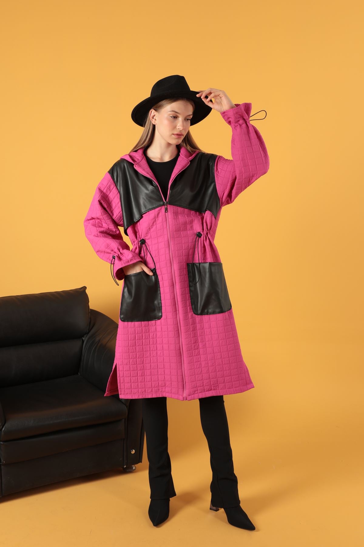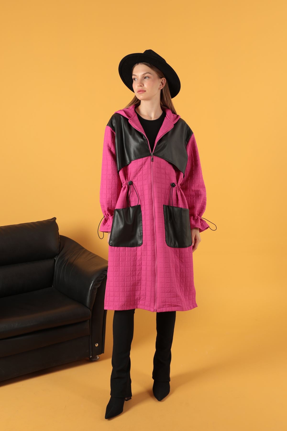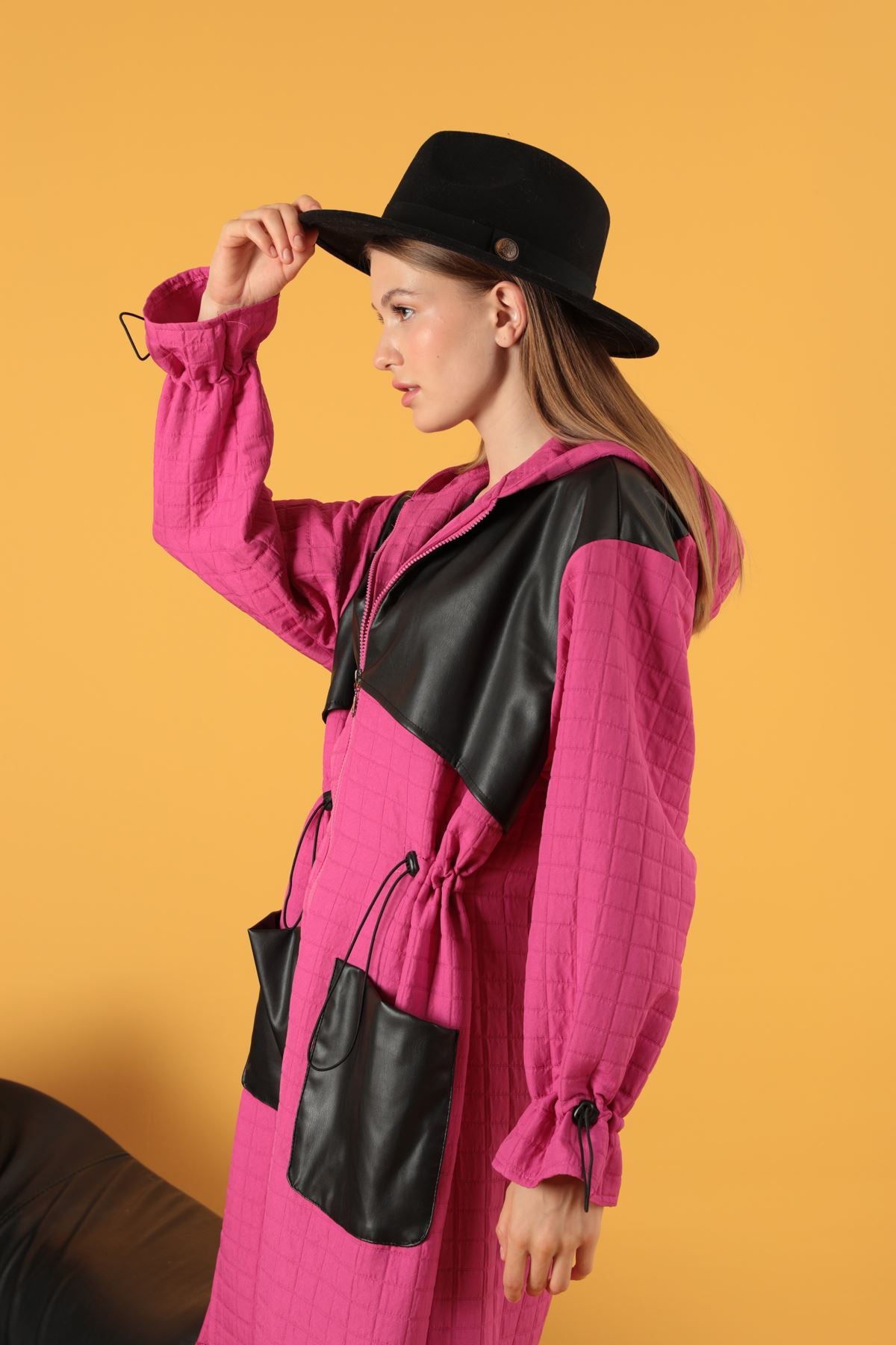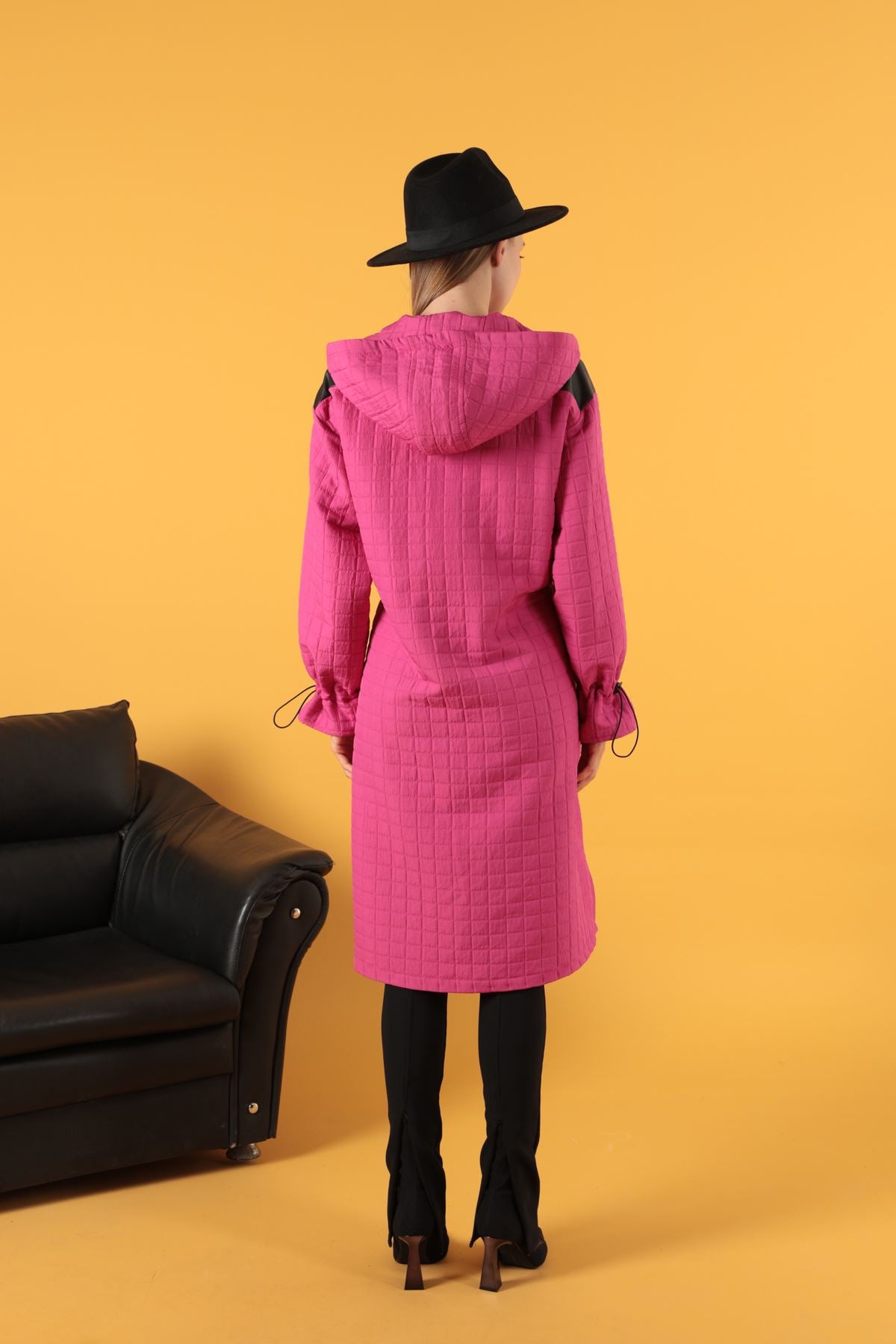 Diger66299Deri Kumaş Garni Detay Jakar Kadın Trençkot-Fuşya