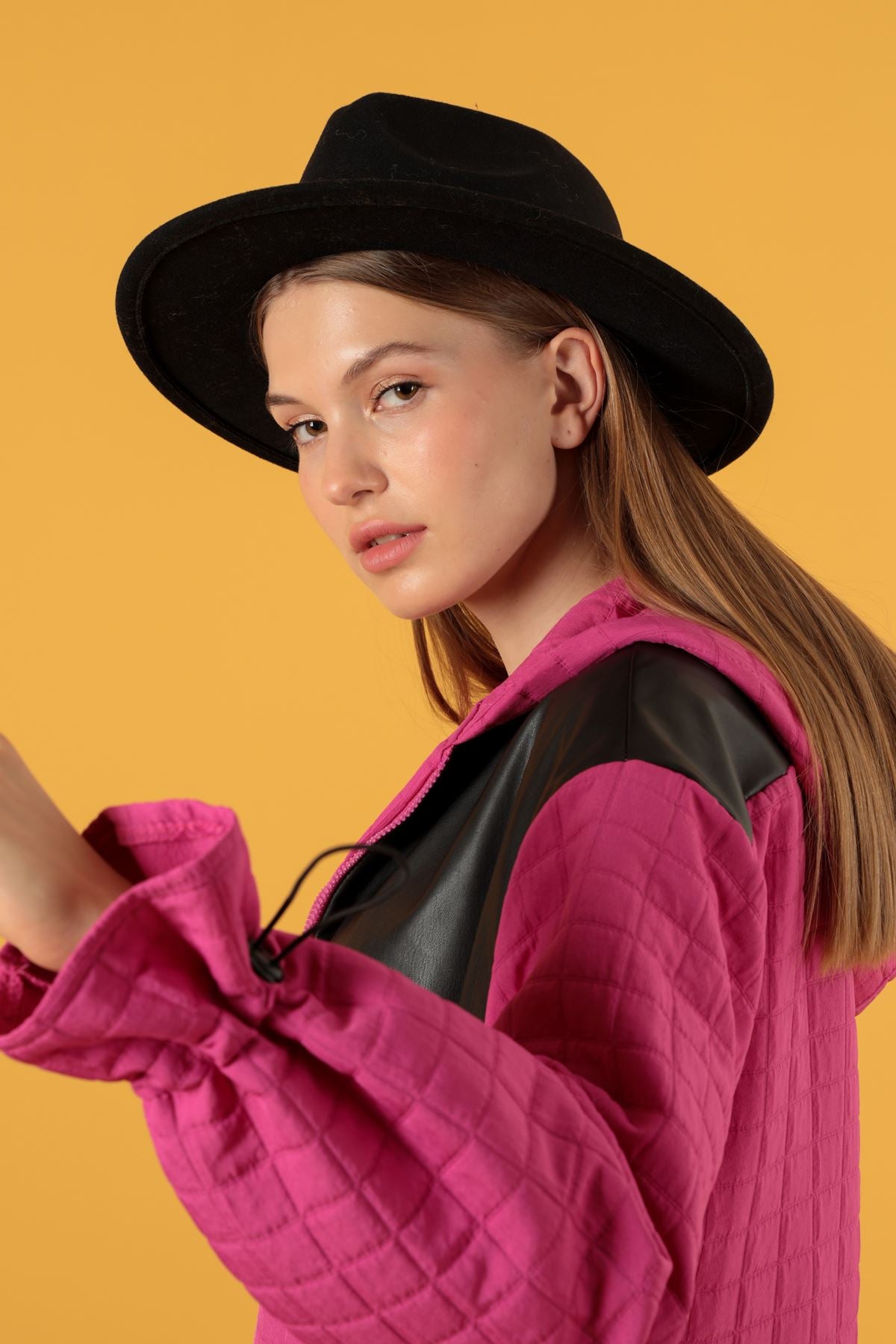 Deri Kumaş Garni Detay Jakar Kadın Trençkot-Fuşya