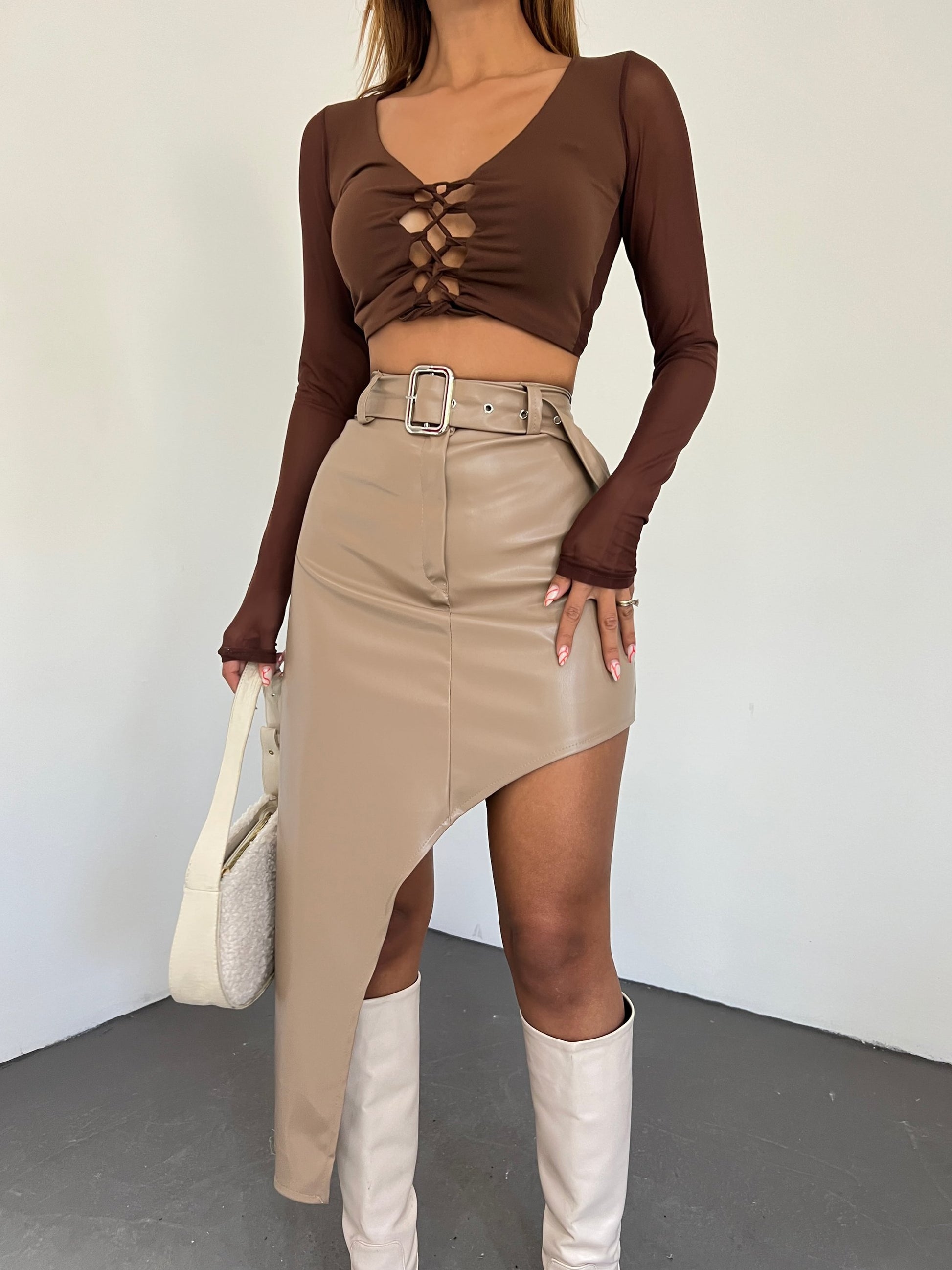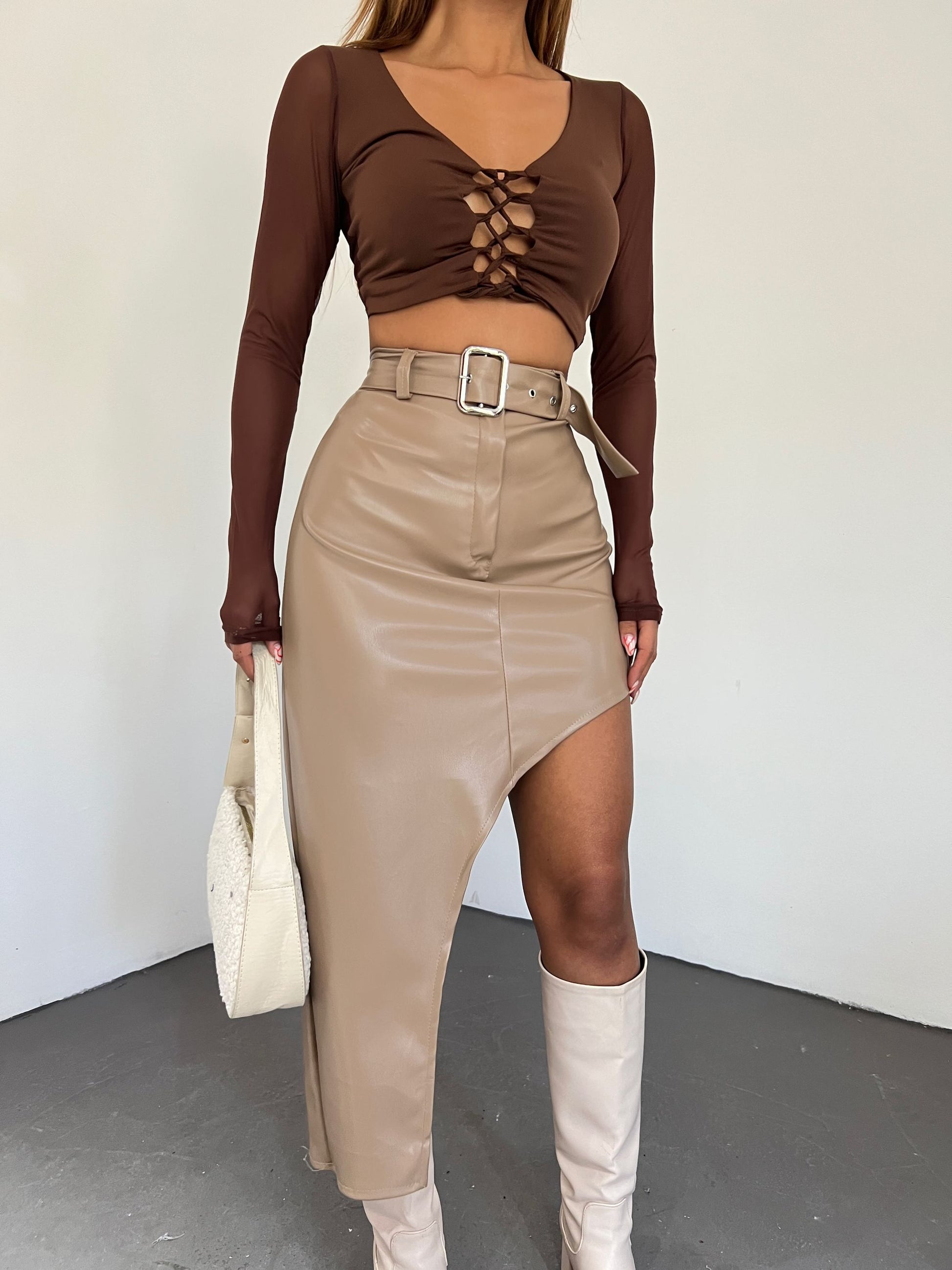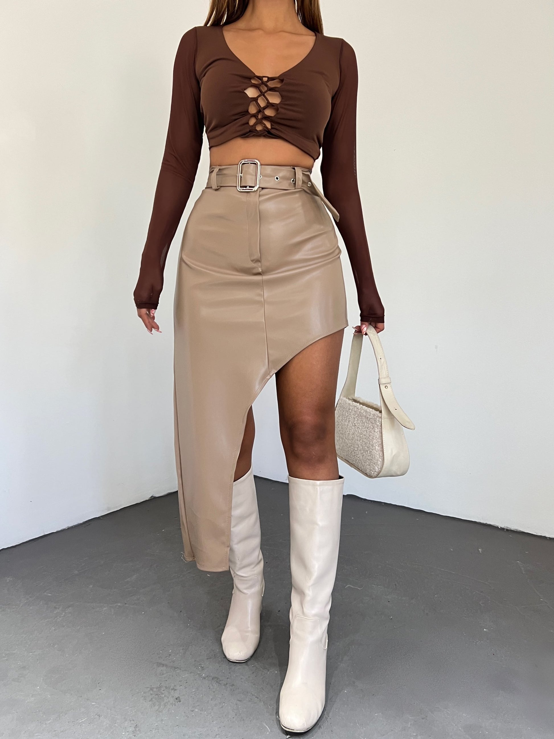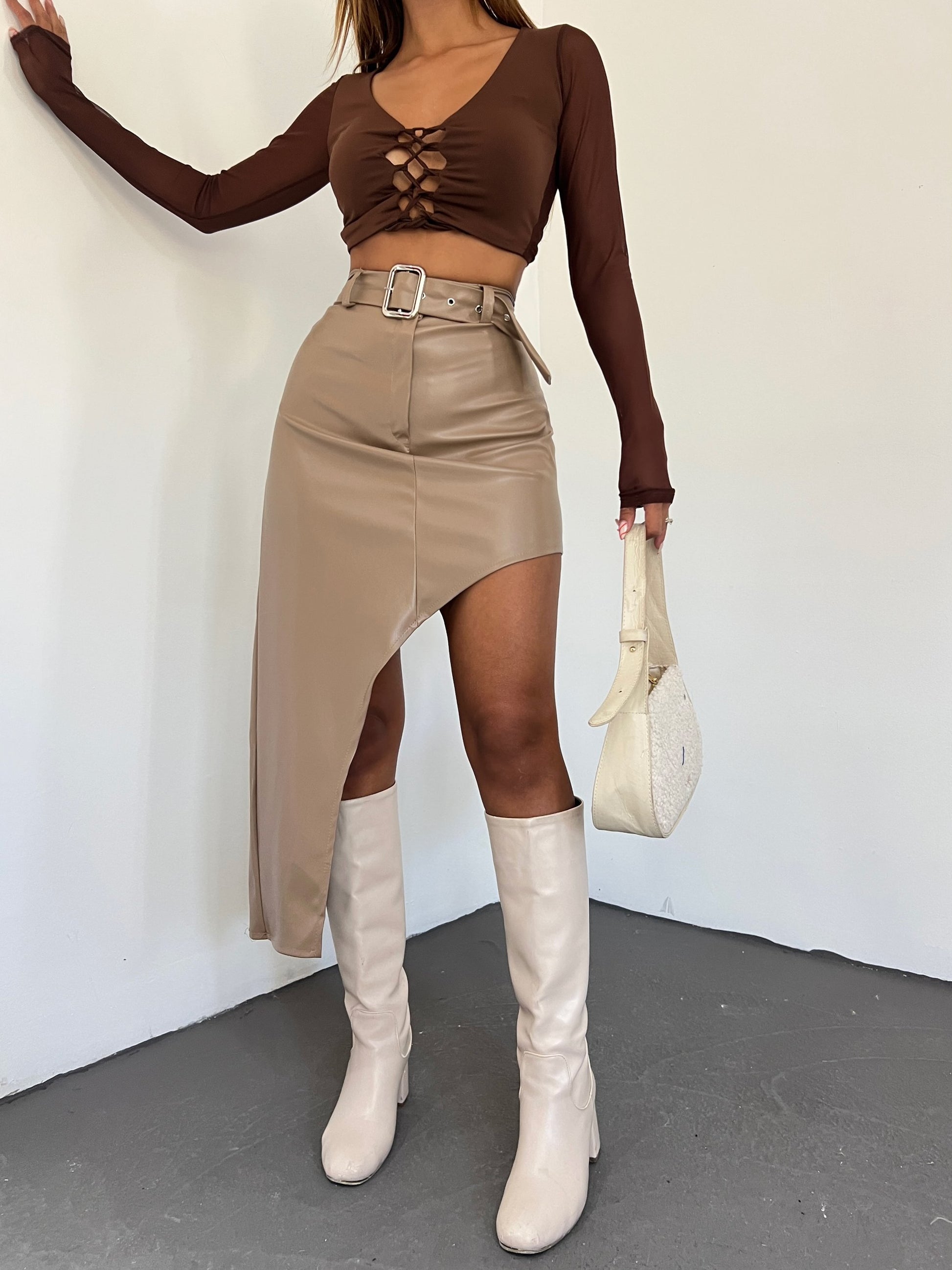 Derin Yırtmaç Detaylı Kemerli Suni Deri Etek