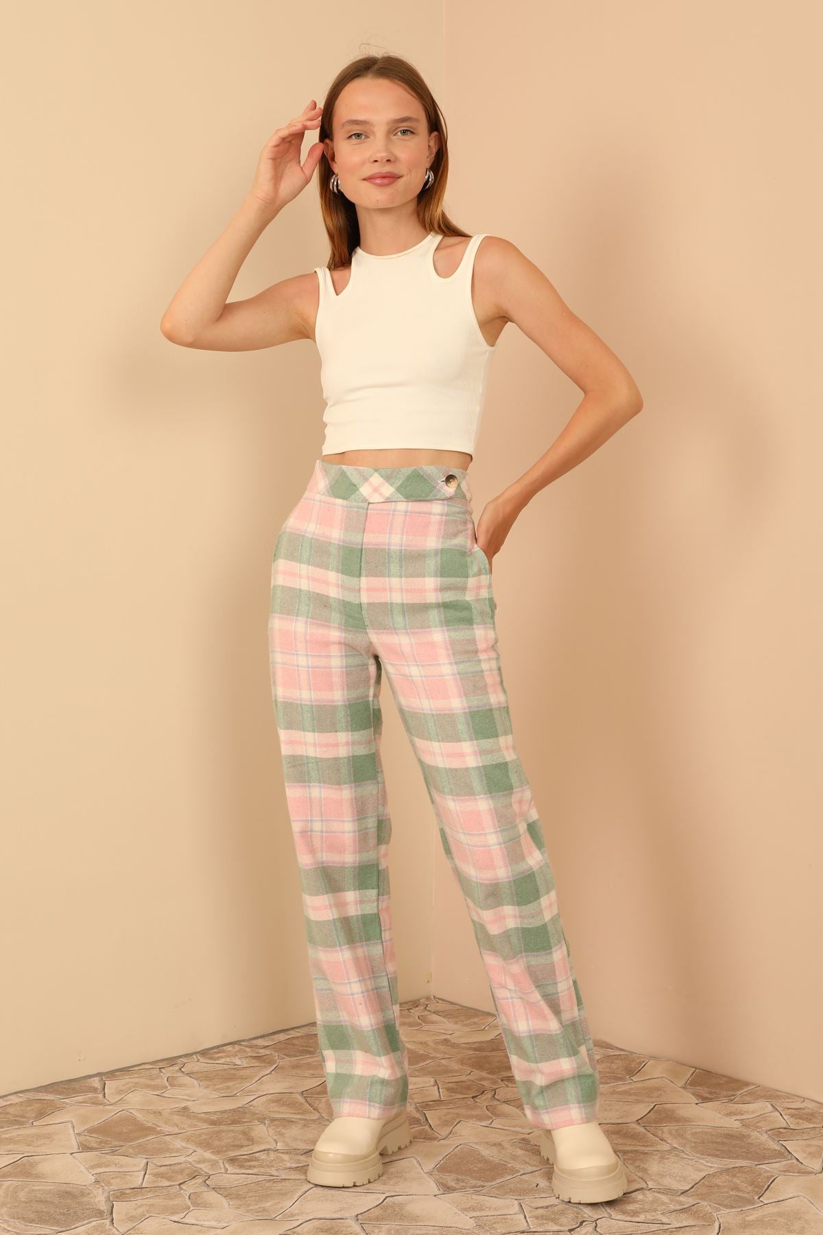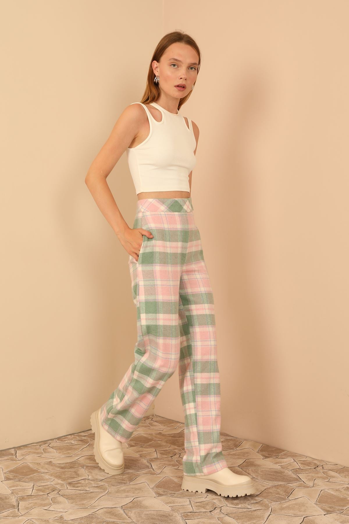 Diger66527Ekose Kumaş Rahat Kalıp Kadın Pantolon-Pembe