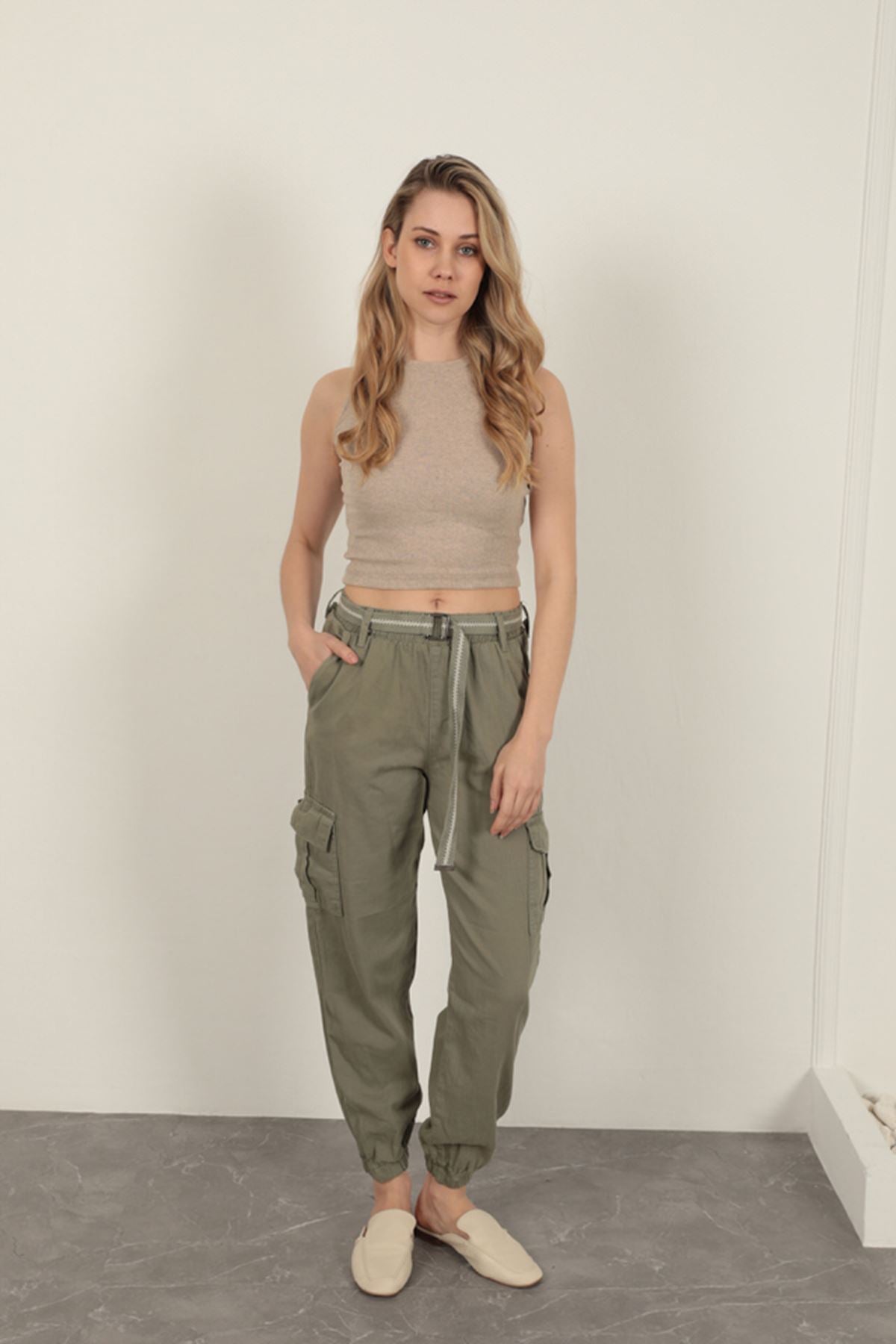 Gabardin Kumaş Kemerli Kargo Kadın Pantolon-Haki