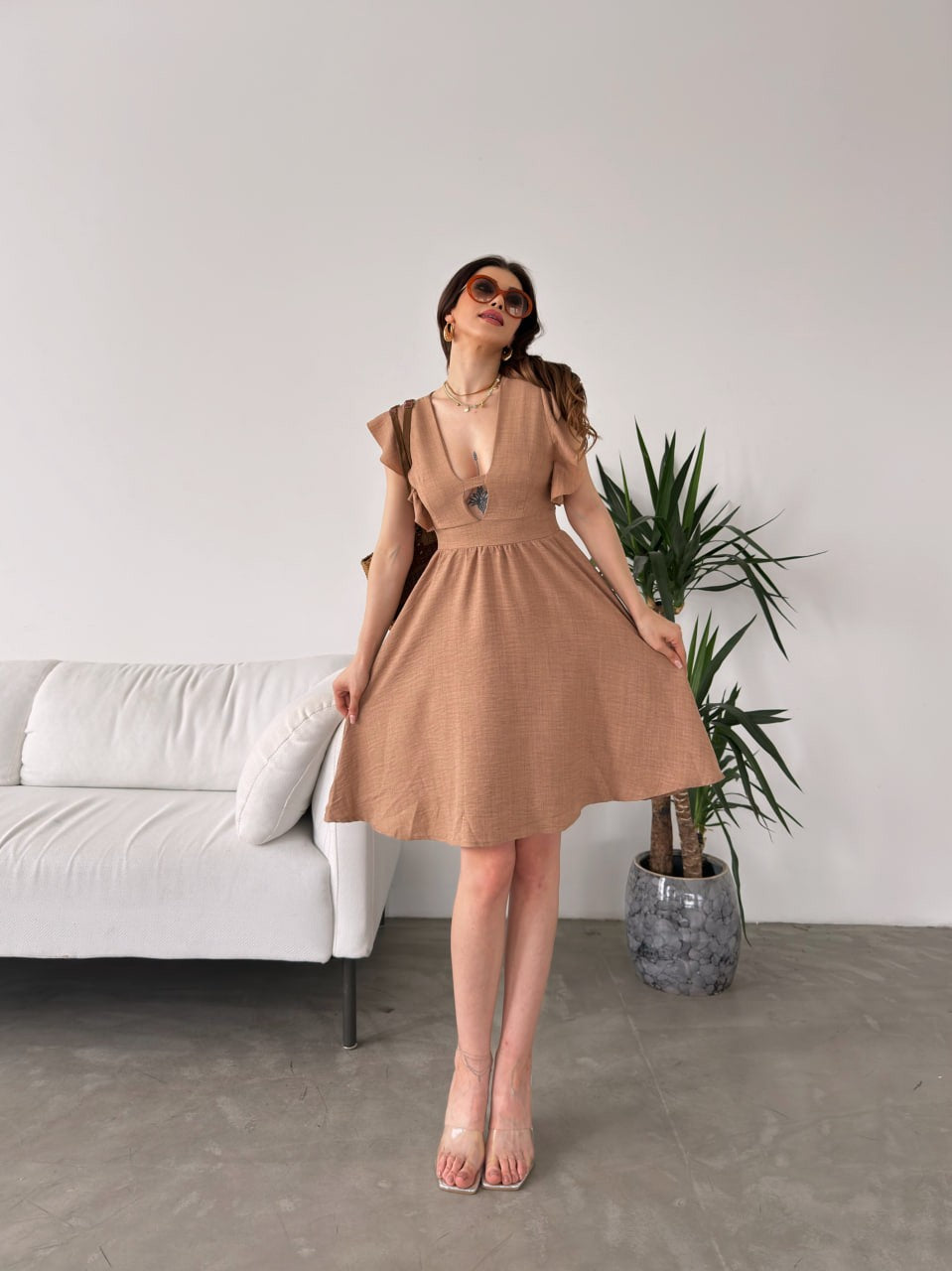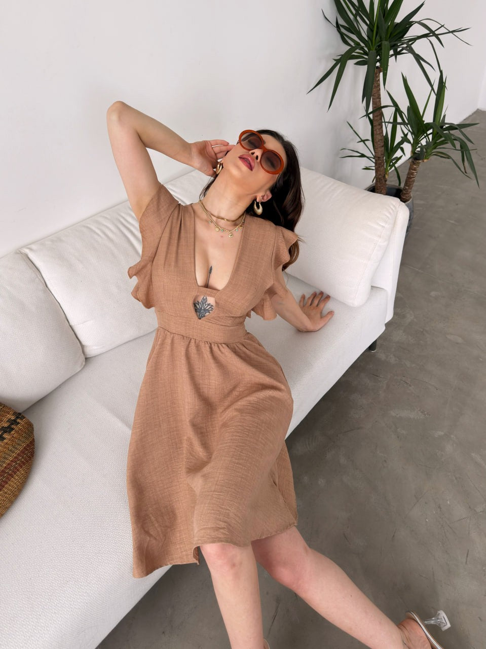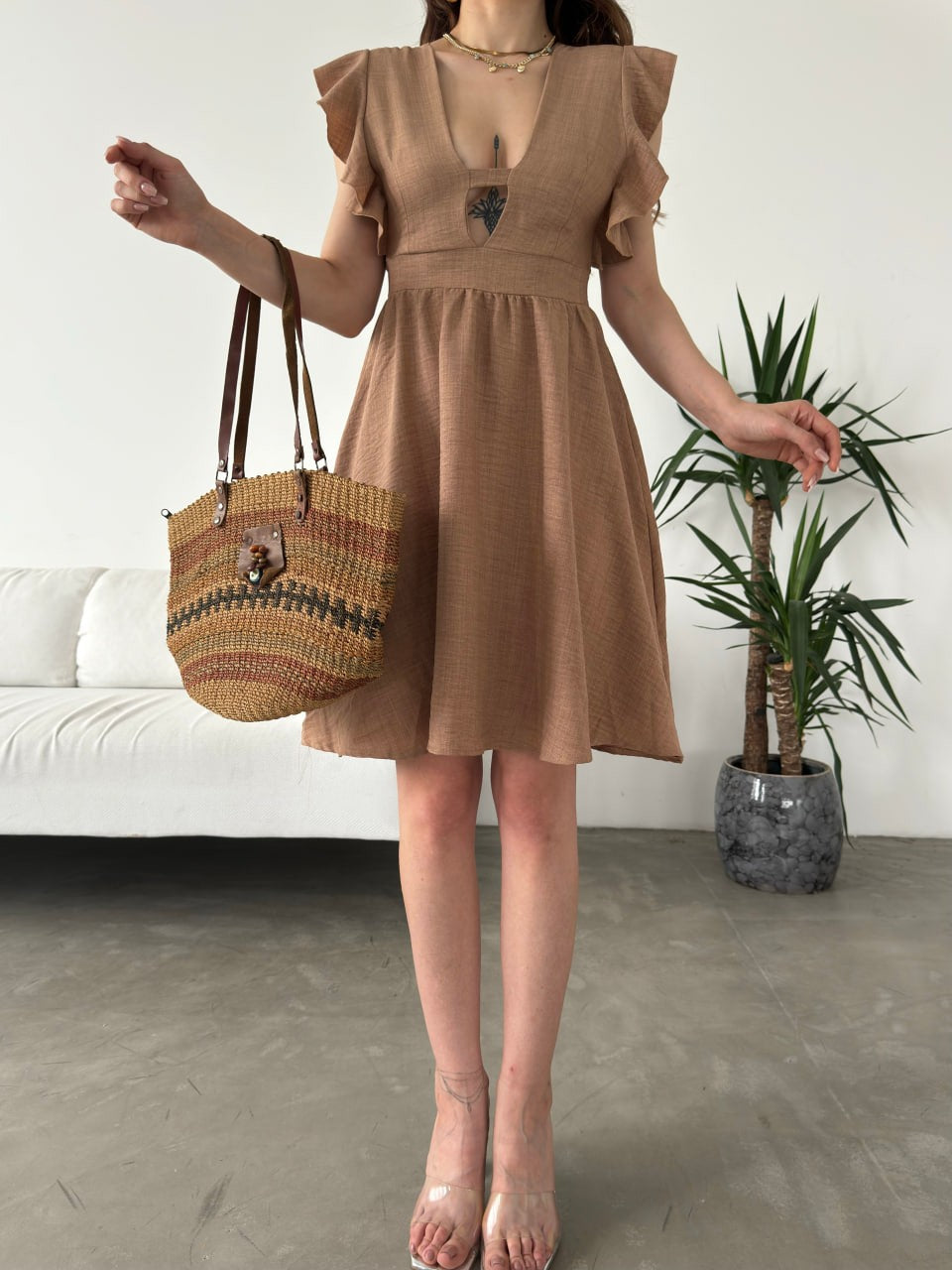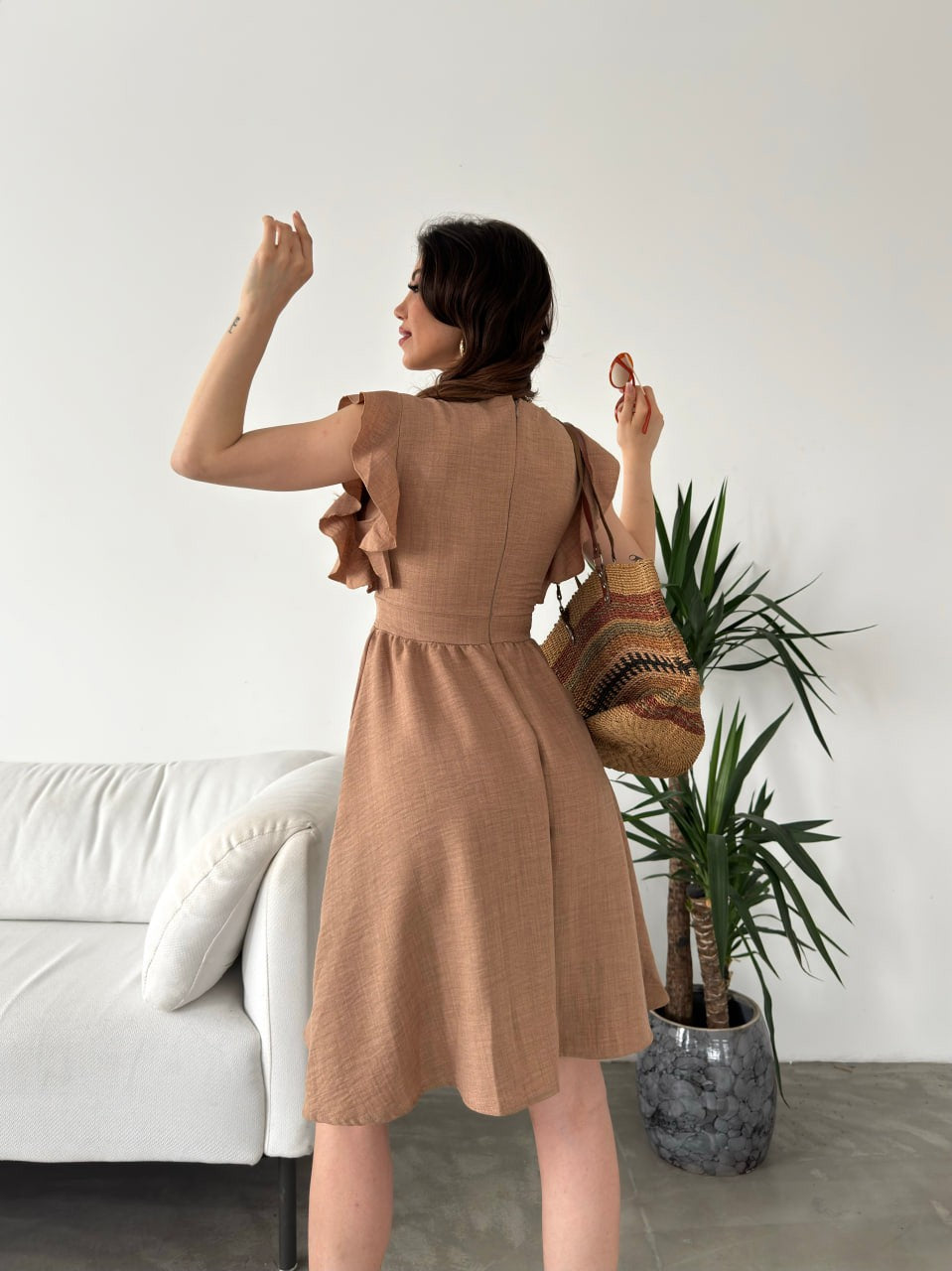 Göğüs Dekolteli Kolları Volanlı Elbise