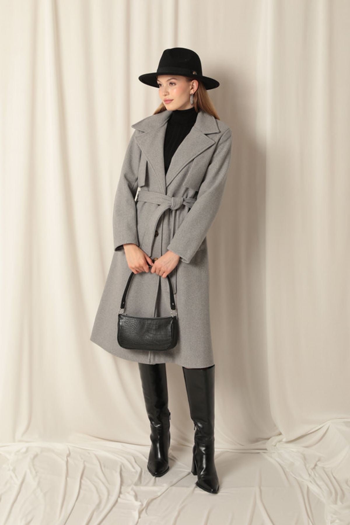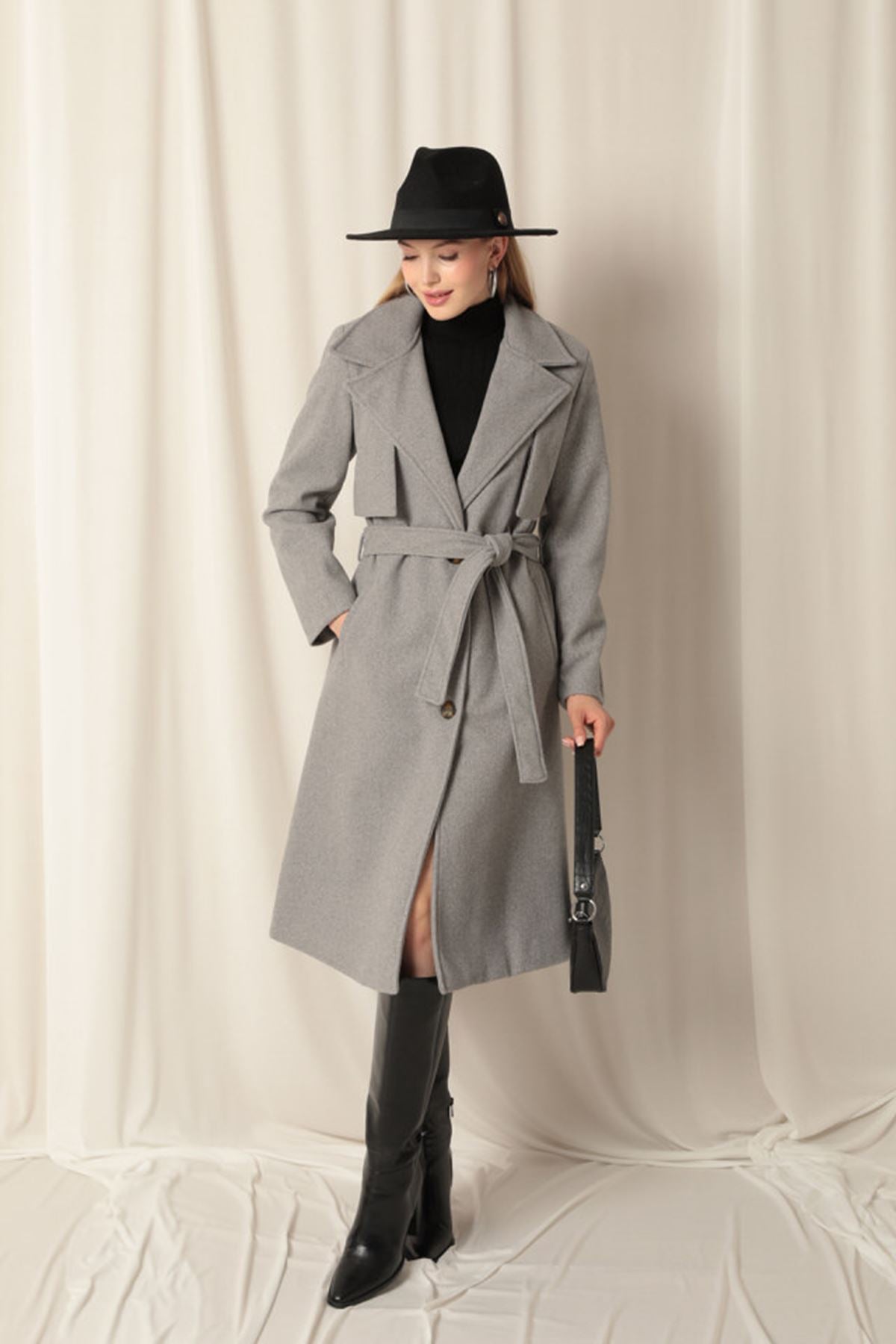 Diger71256Kaşe Kumaş Allerli Kadın Gri Kaban