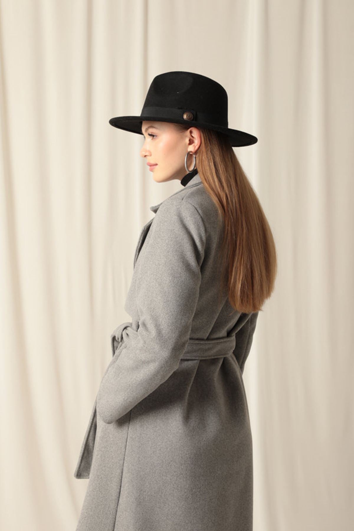 Kaşe Kumaş Allerli Kadın Gri Kaban