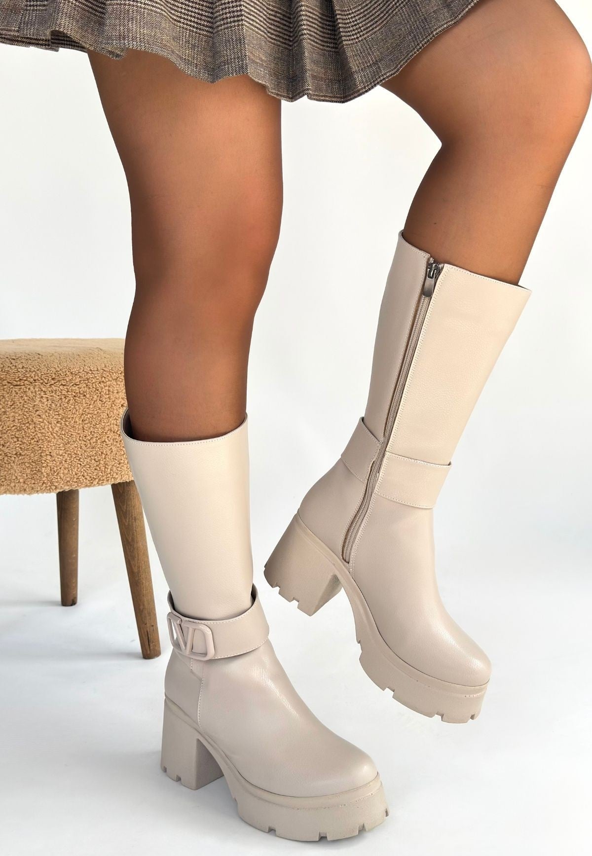 Moki Bej Cilt Topuklu Çizme