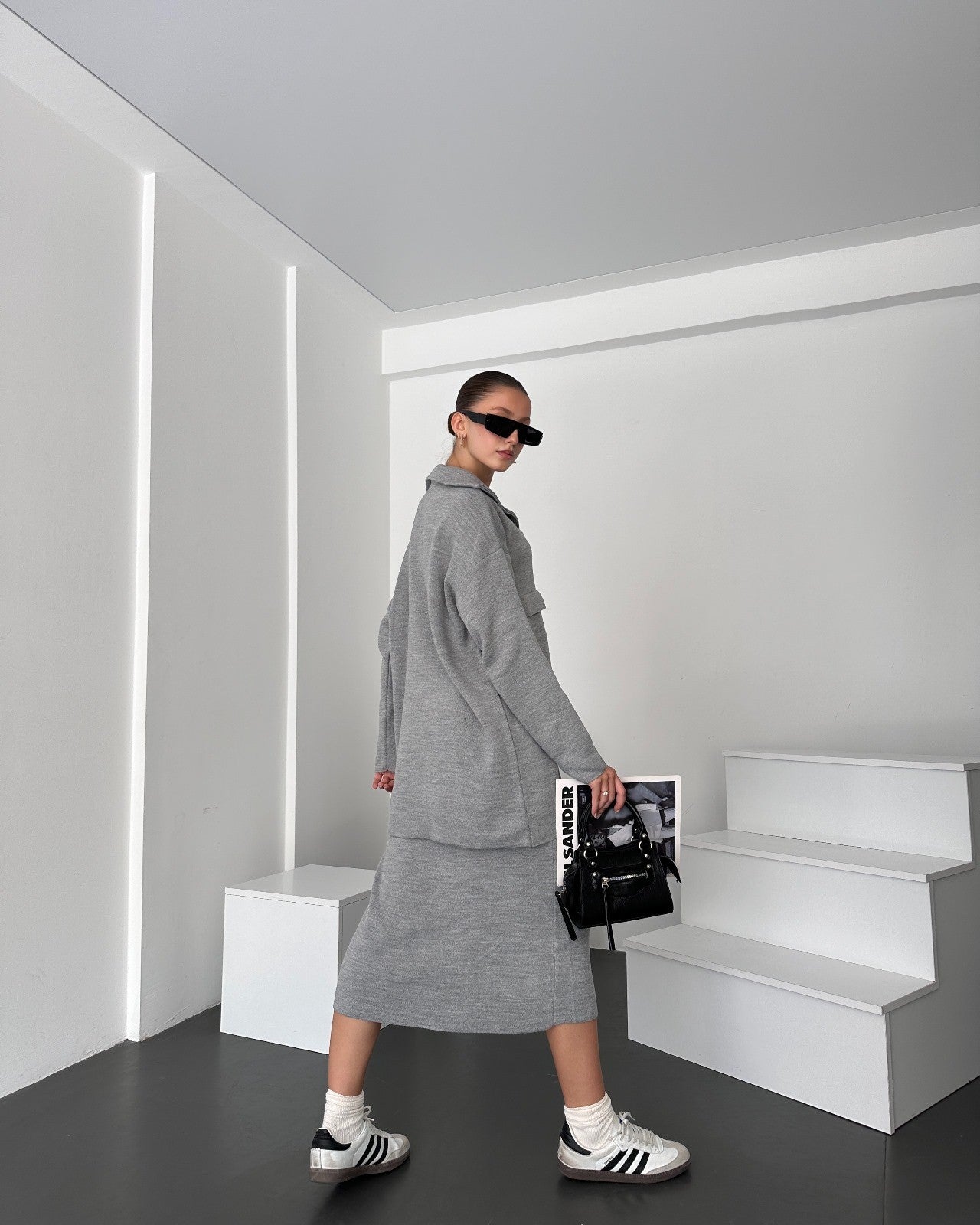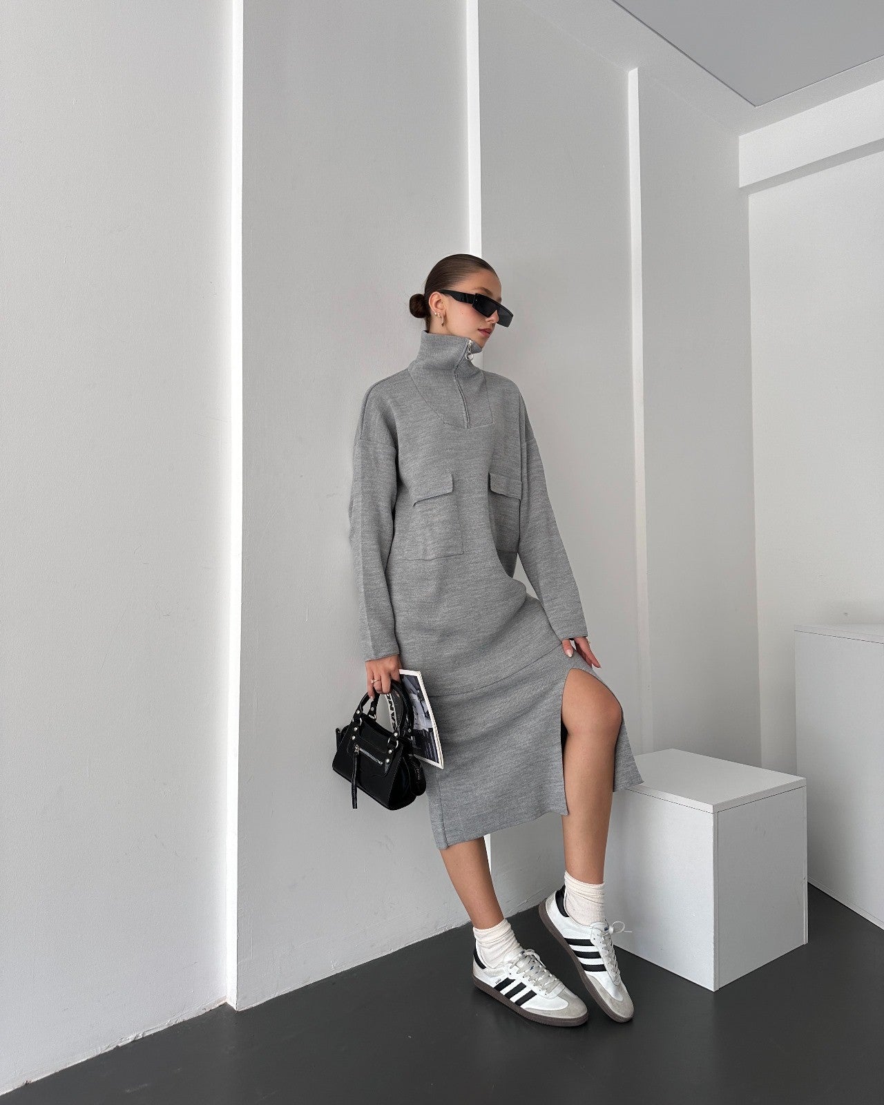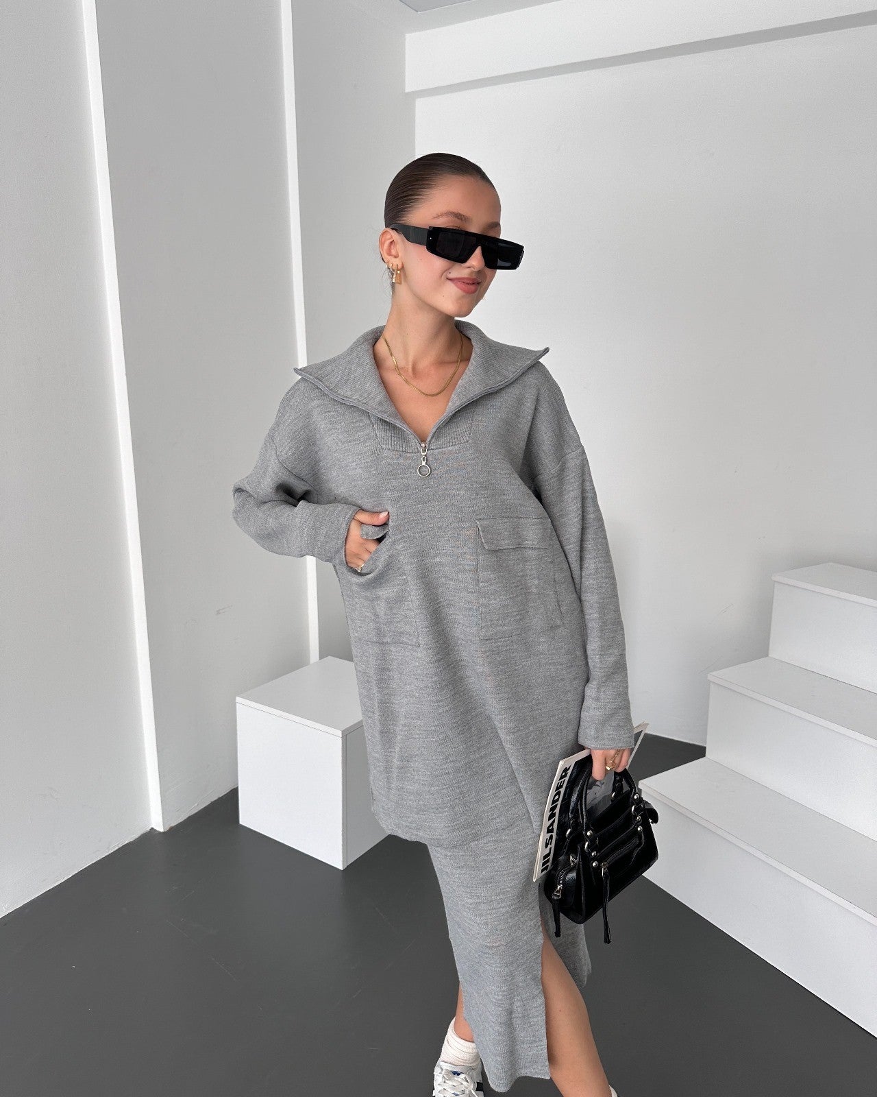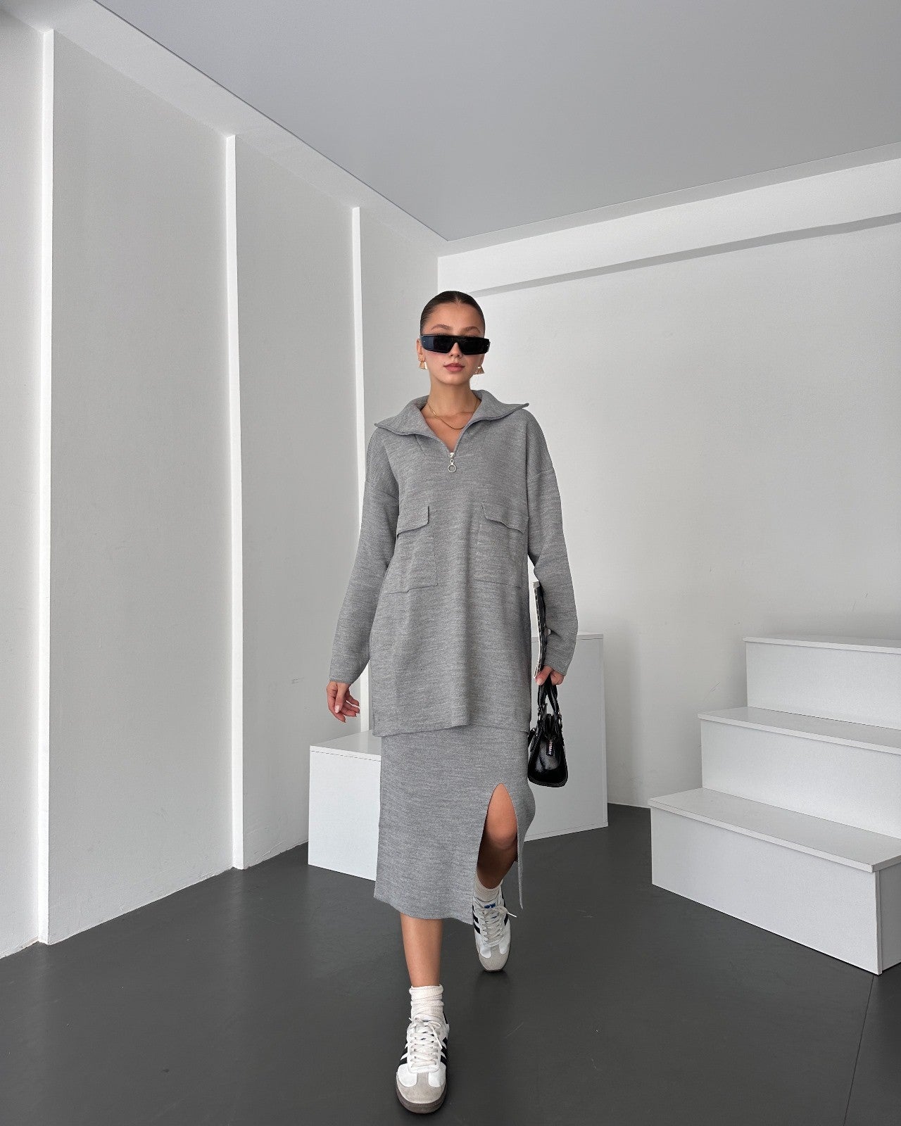 Önü Fermuarlı Kazak Ve Yırtmaç Detaylı Etek Alt Üst Triko Takım