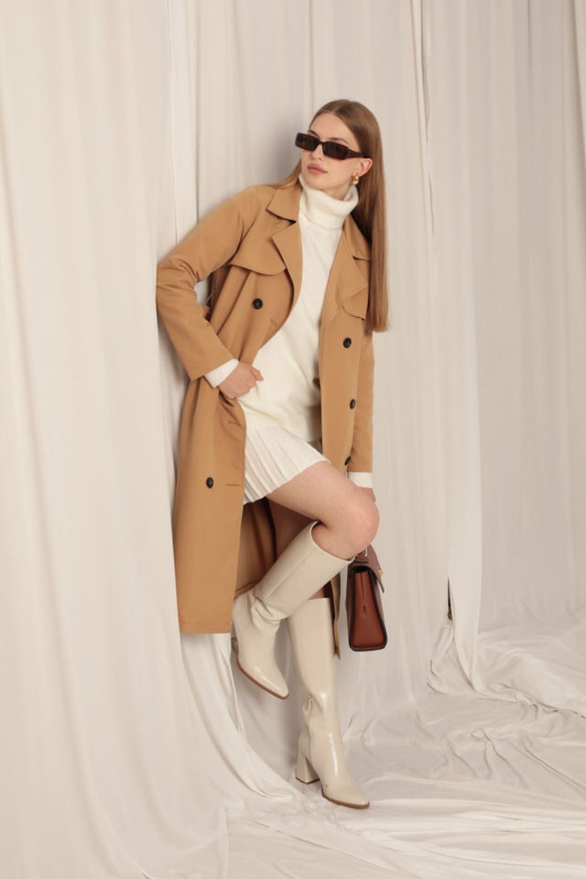 Torino Kumaş Sıvı Geçirmez Maxi Boy Kadın Camel Trençkot