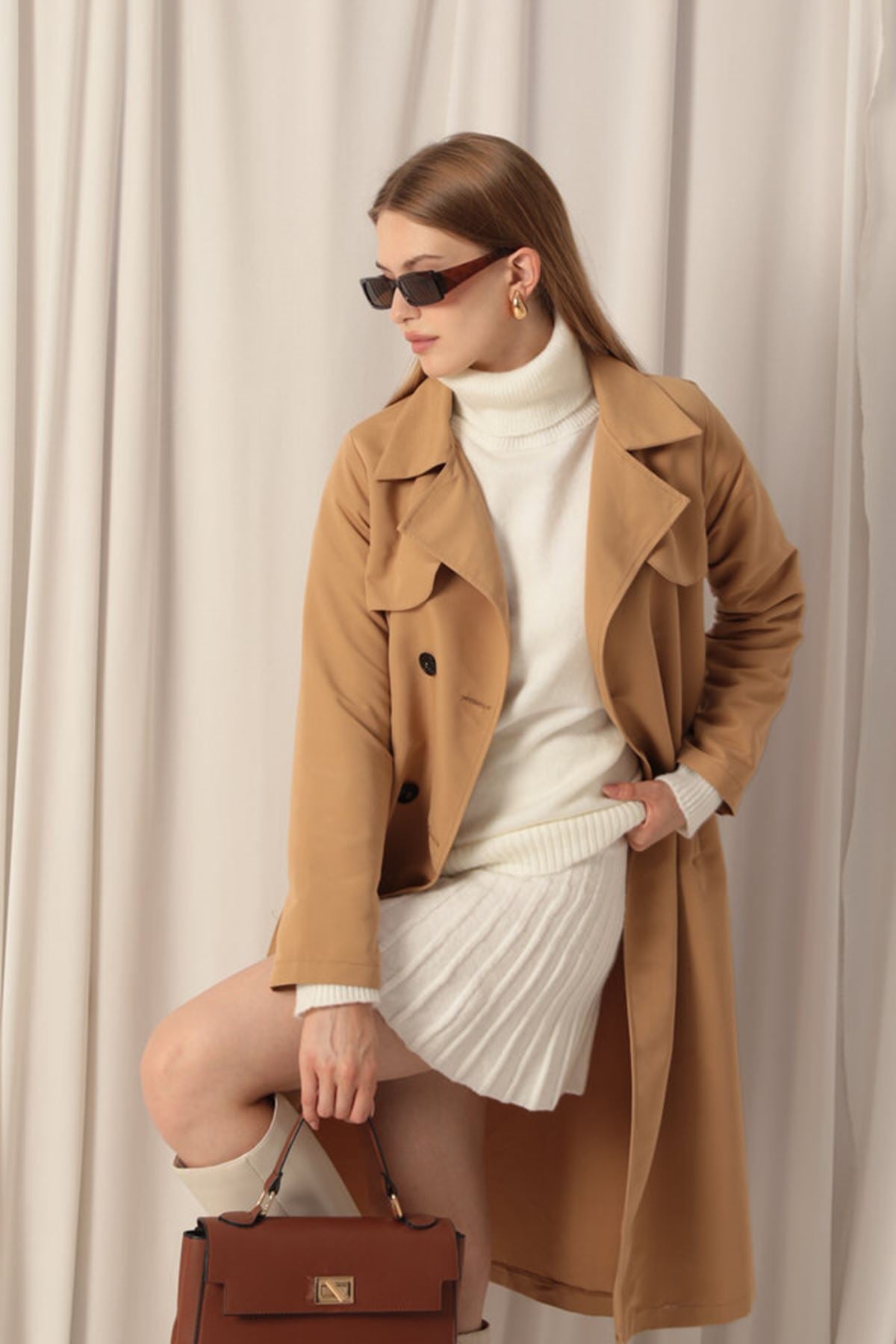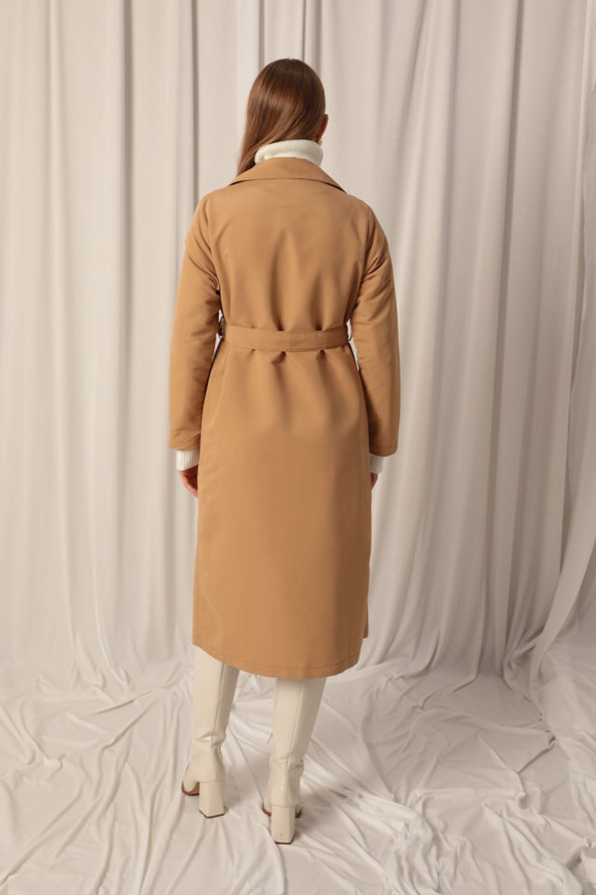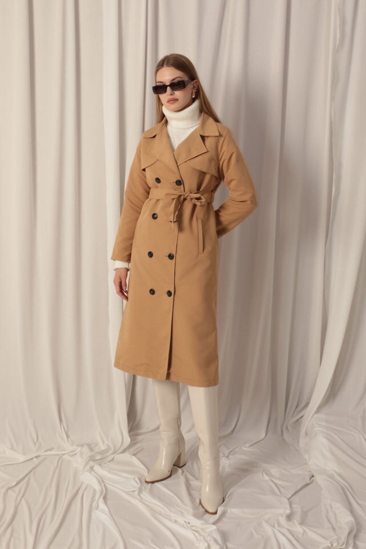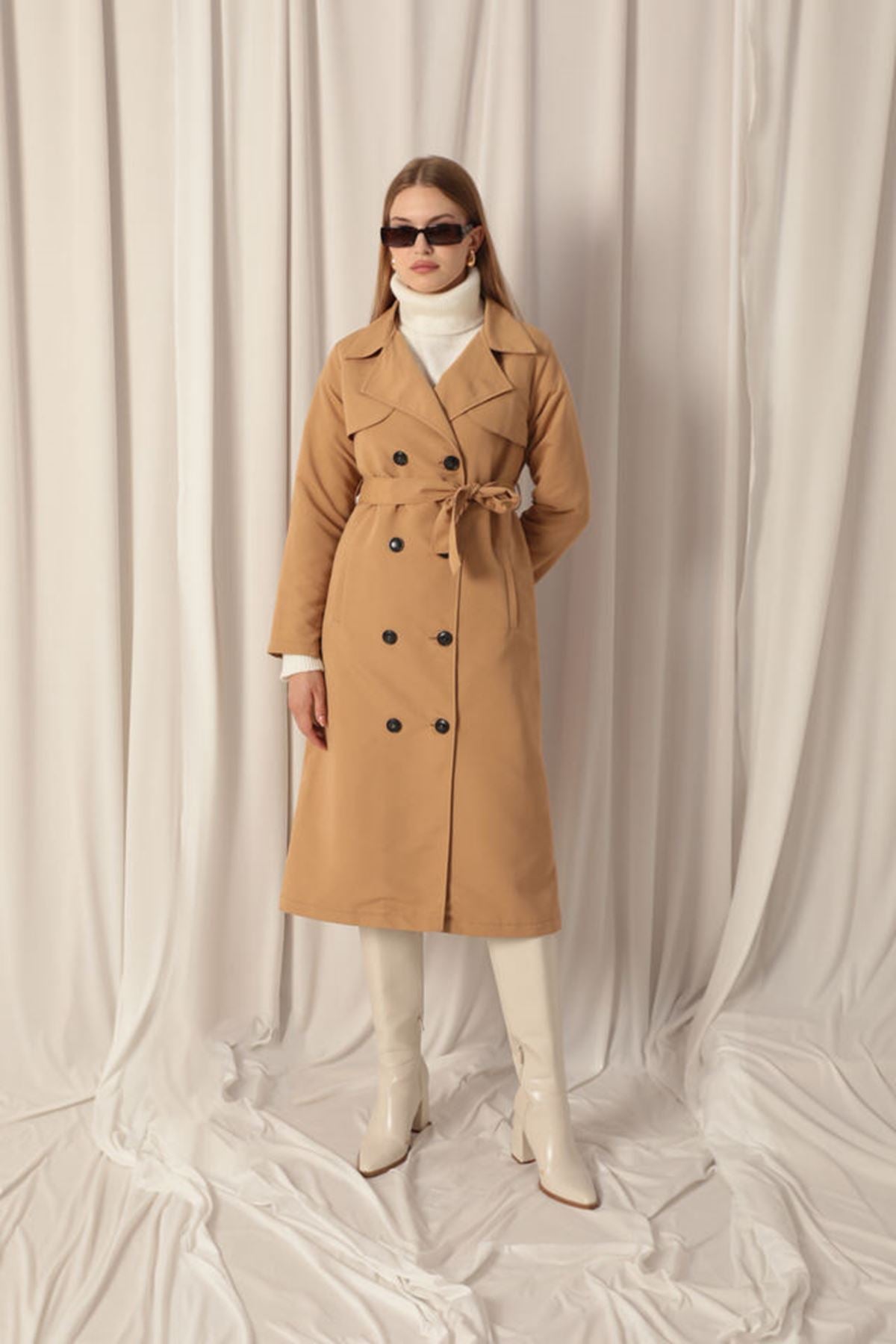 Diger72054Torino Kumaş Sıvı Geçirmez Maxi Boy Kadın Camel Trençkot