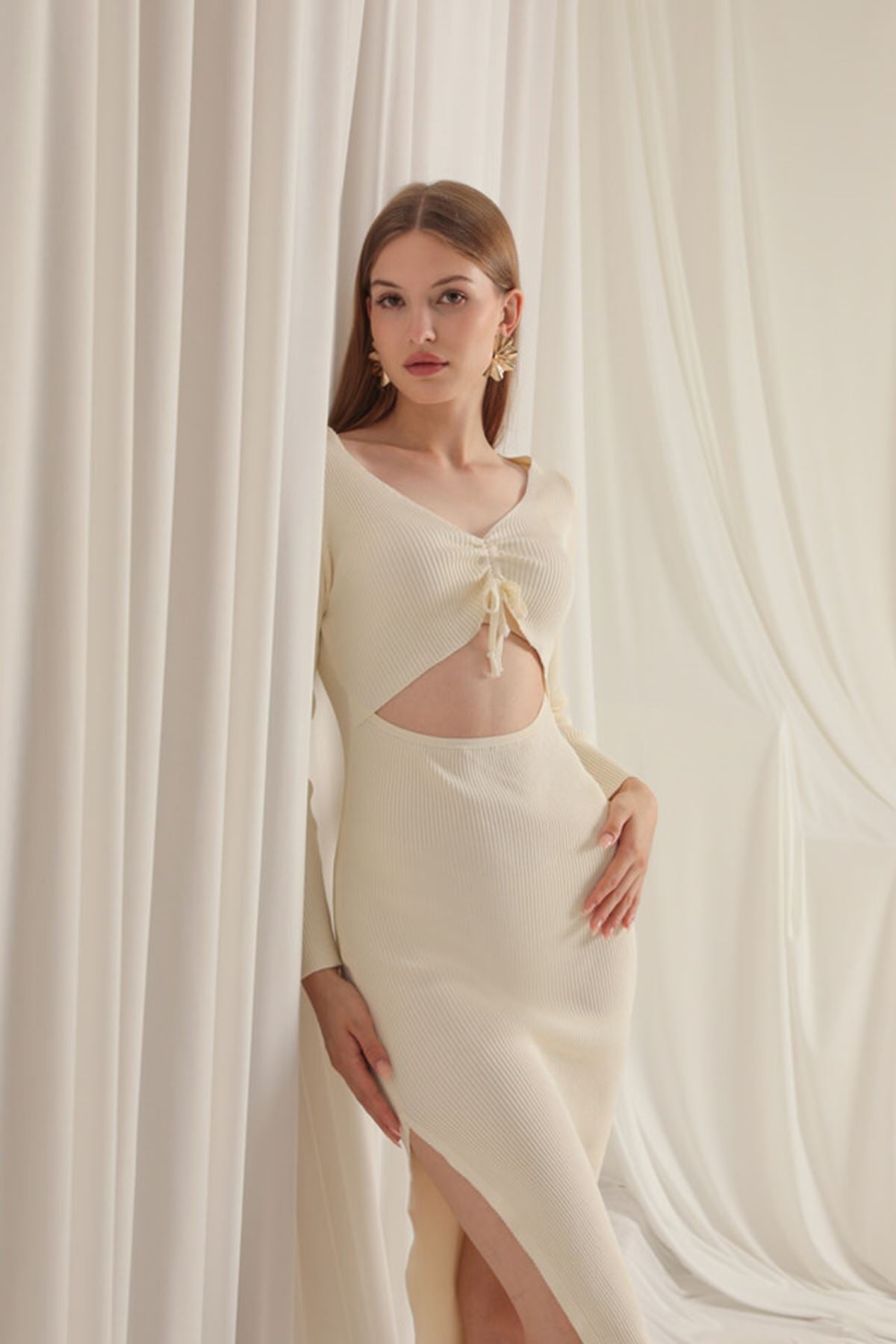Triko Kumaş Dekolteli Kadın Ekru Elbise