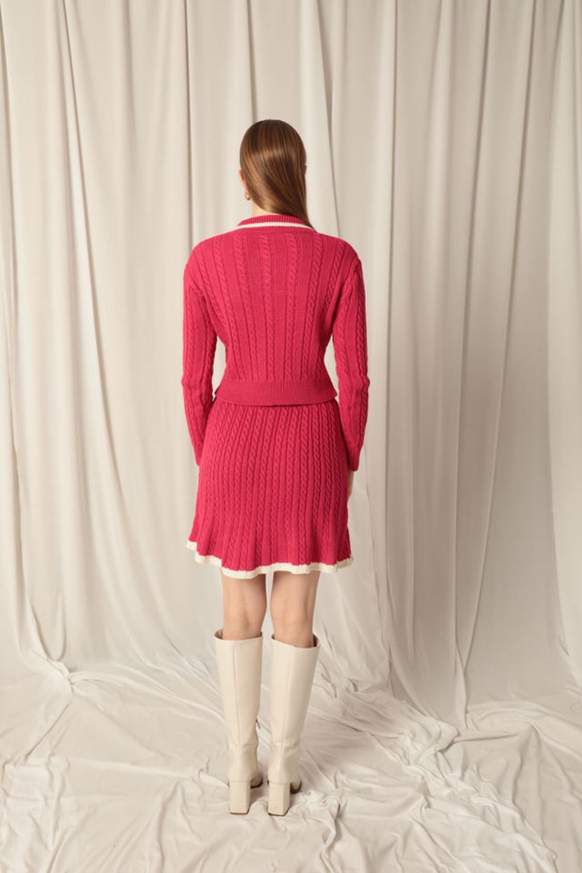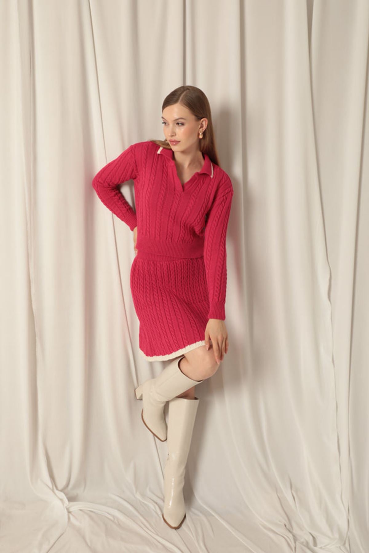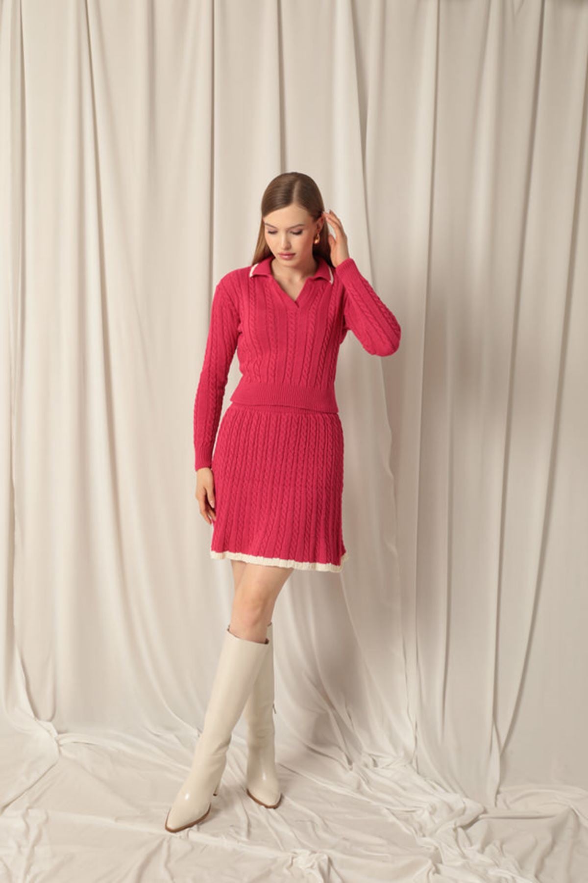 Triko Kumaş Yakalı Saç Örgülü Desen Fuşya Etek Takım
