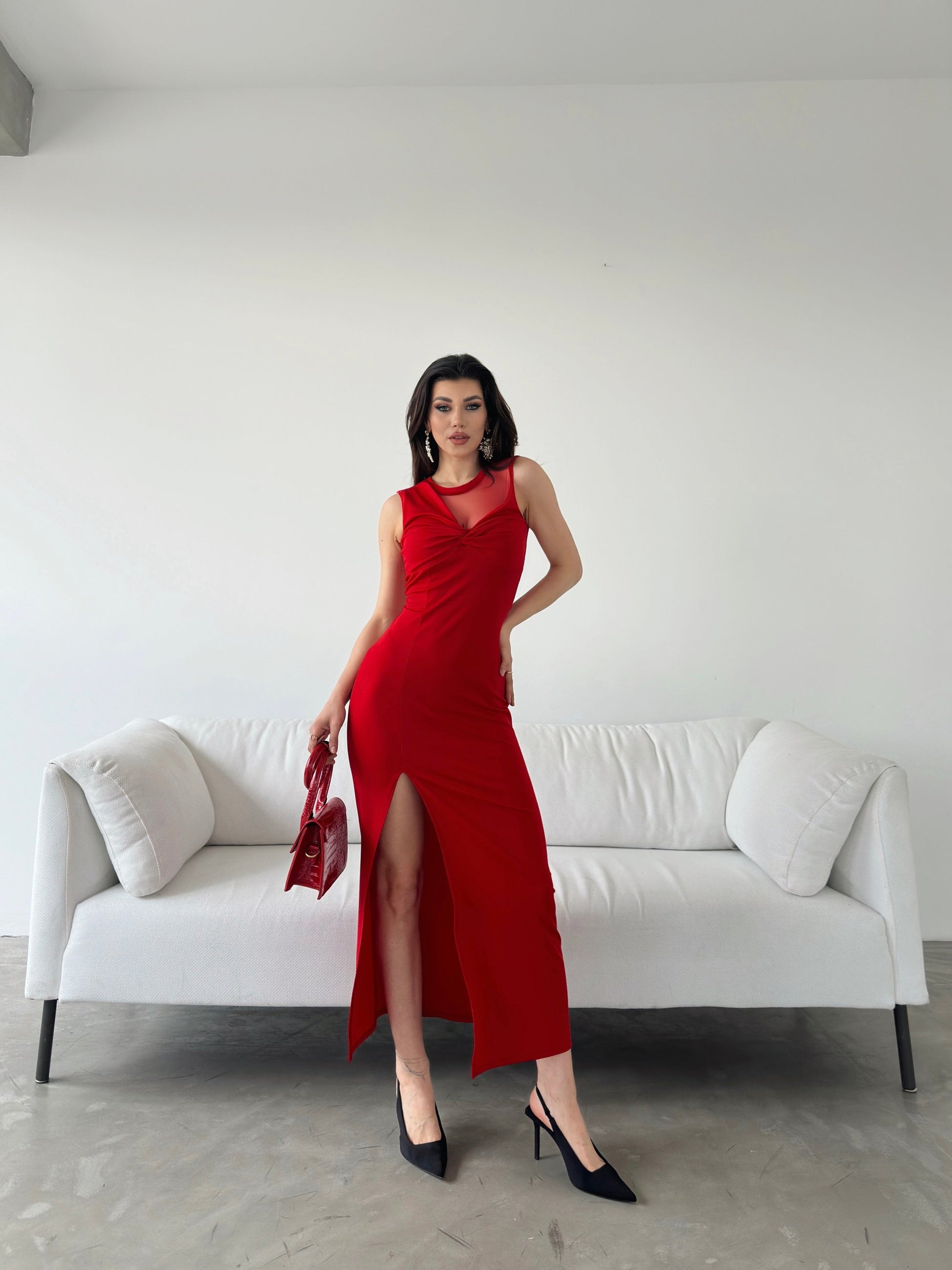 Tül Detaylı Derin Yırtmaçlı Elbise