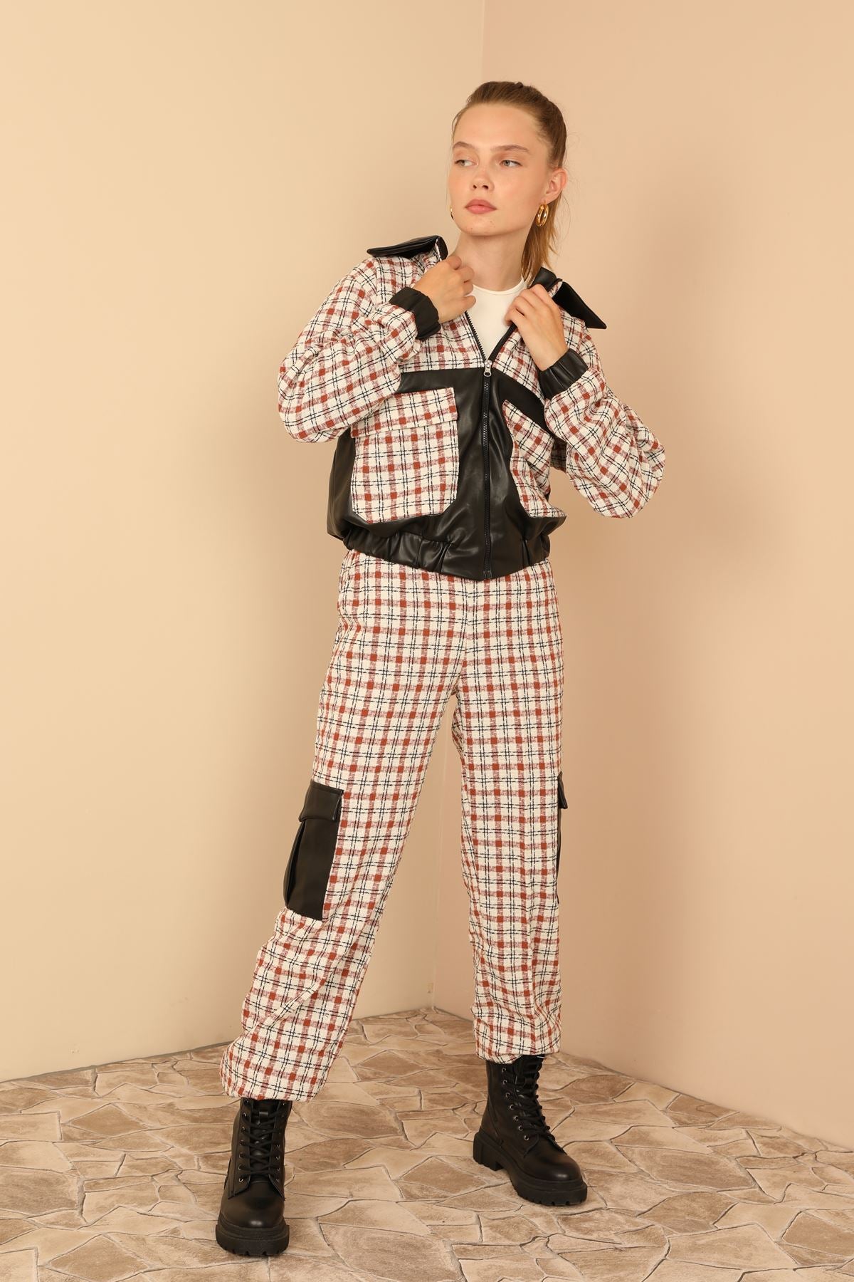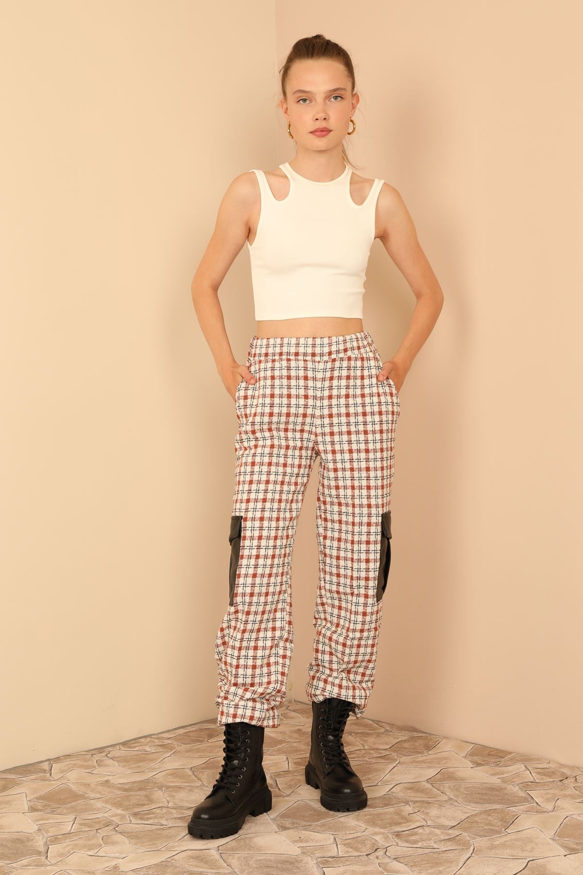 Tüvit Kumaş Uzun Boy Çizgili Kargo Kadın Pantolon-Taba