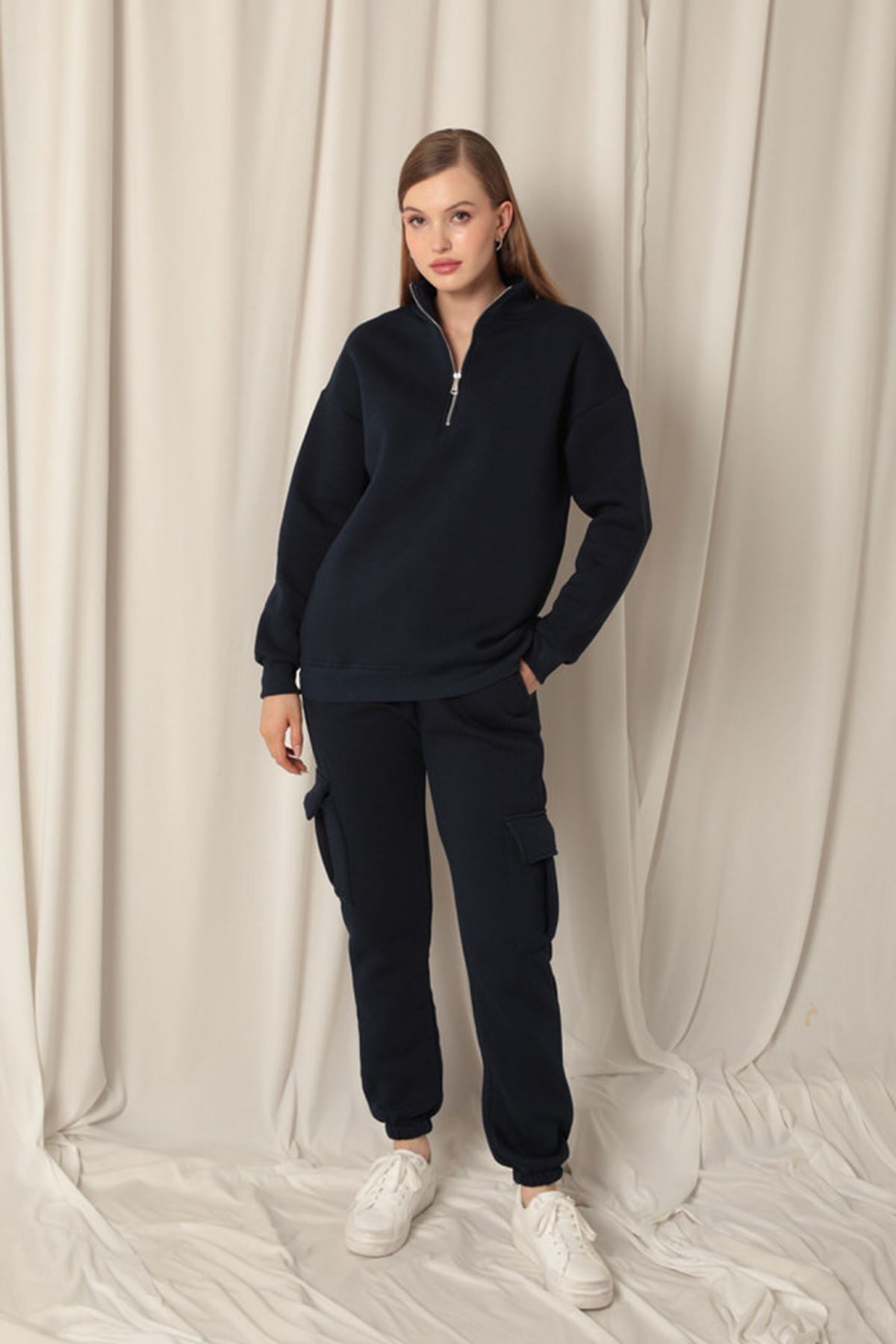 Diger70343Üç İplik Dik Yaka Yarım Fermuarlı Kadın Lacivert Sweat