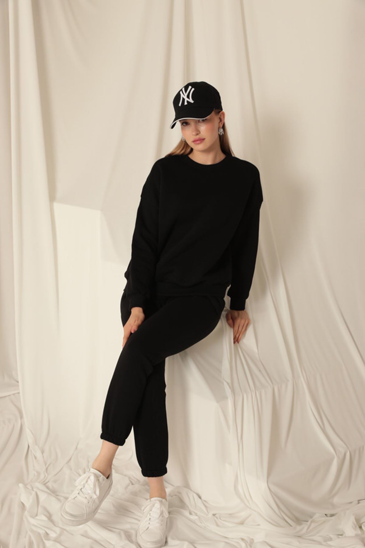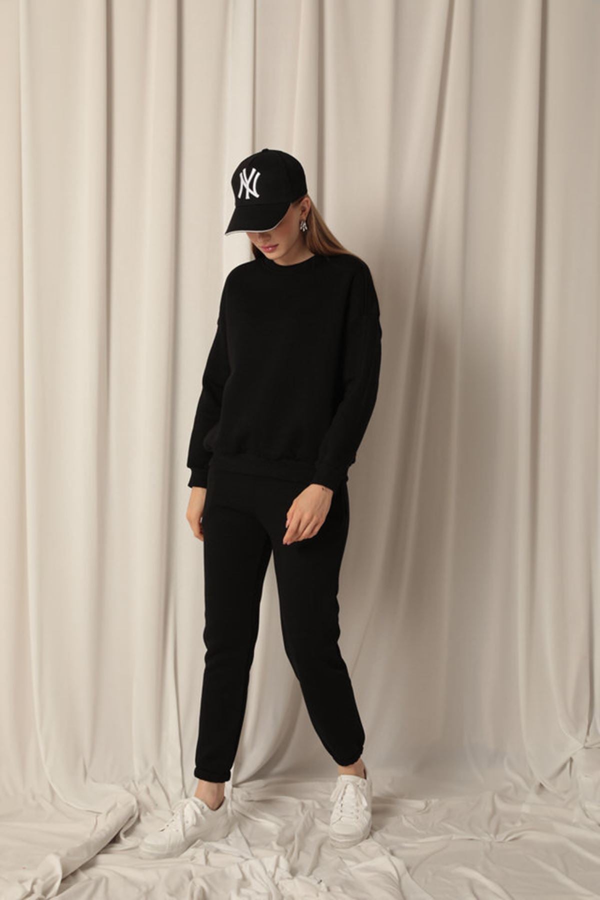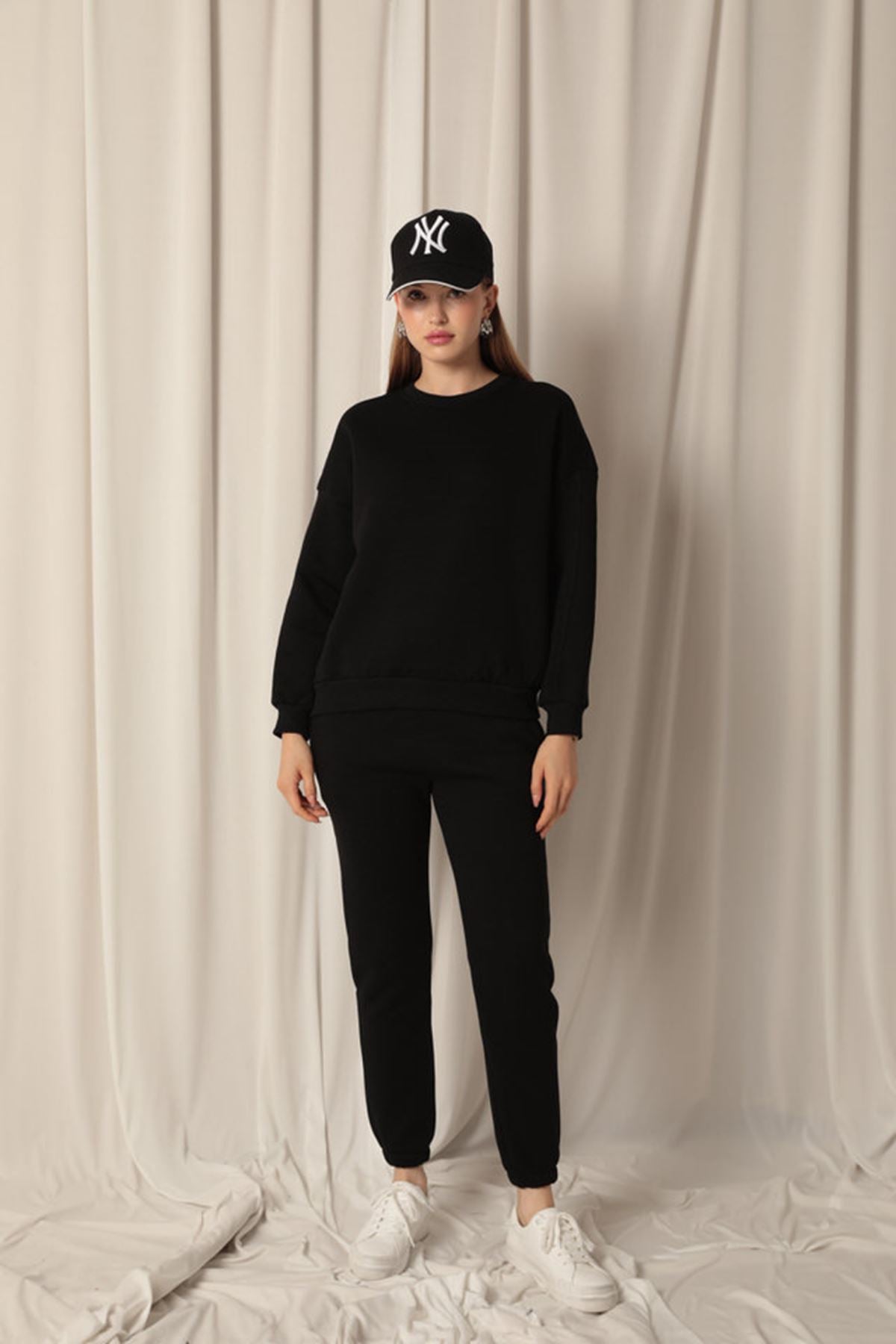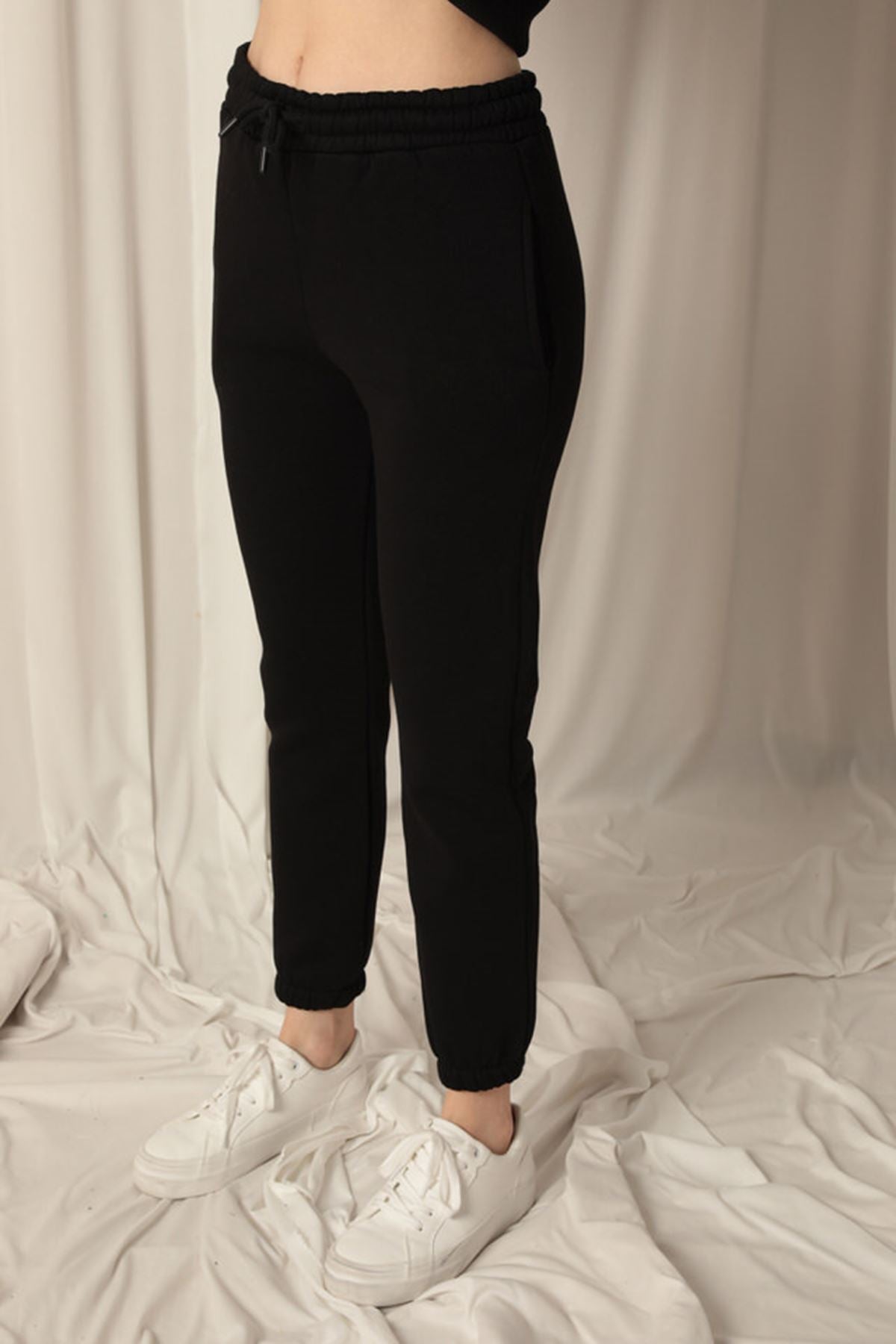 Üç İplik Kumaş Paçası Beli Lastikli Kadın Siyah Eşofman Altı