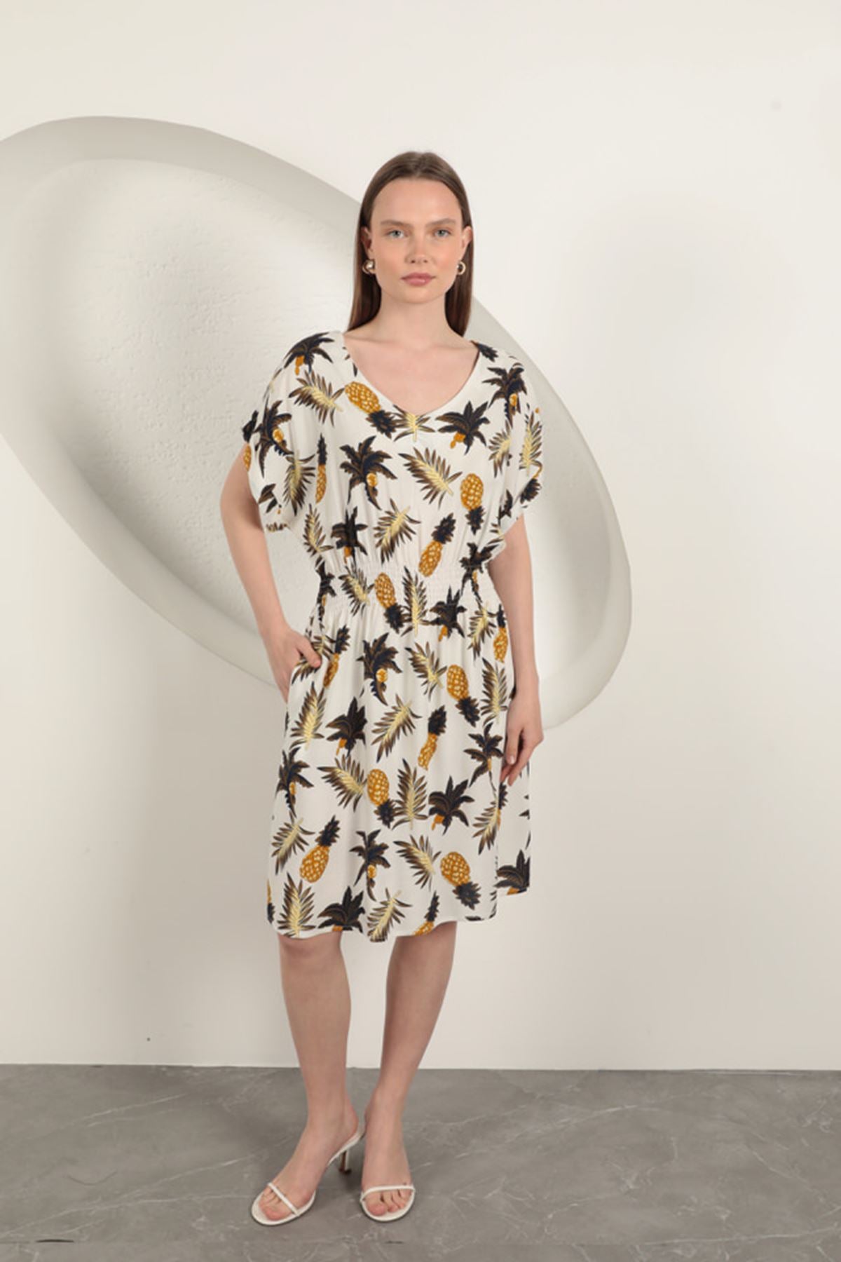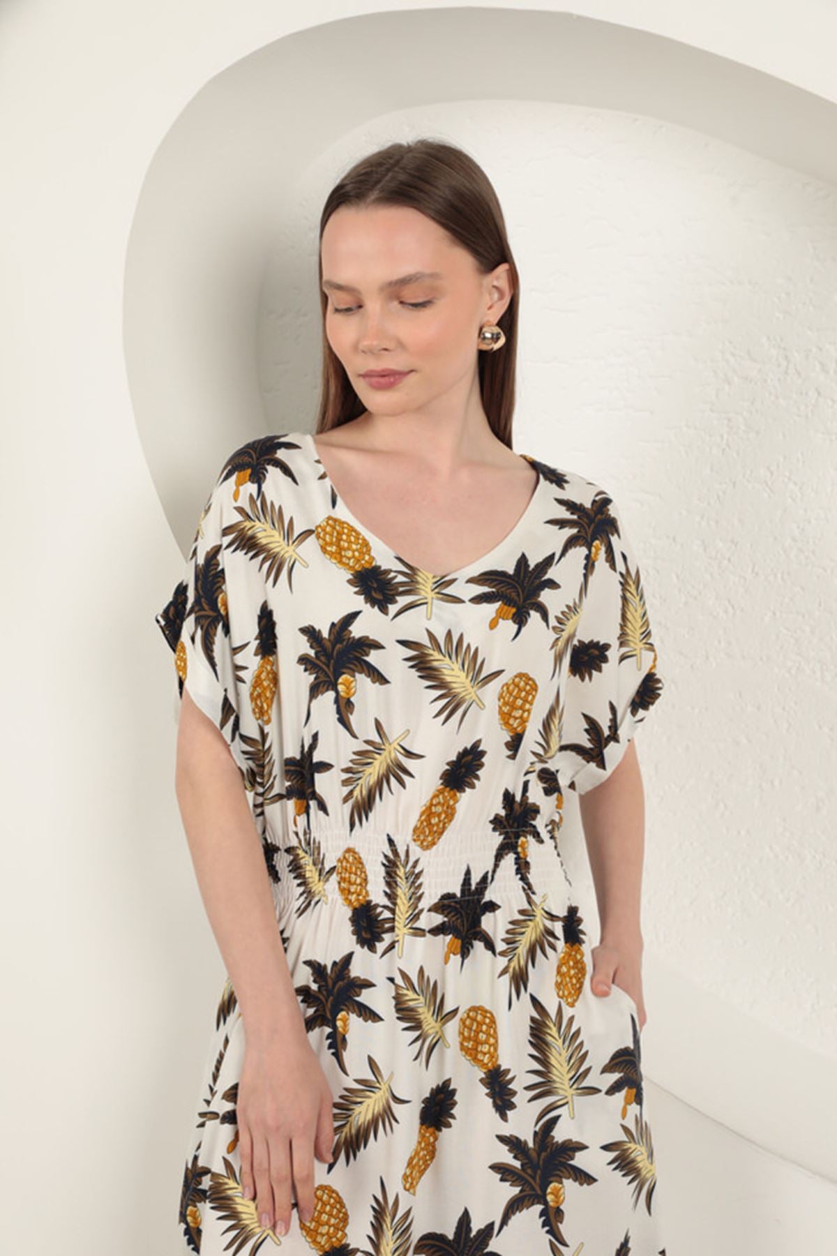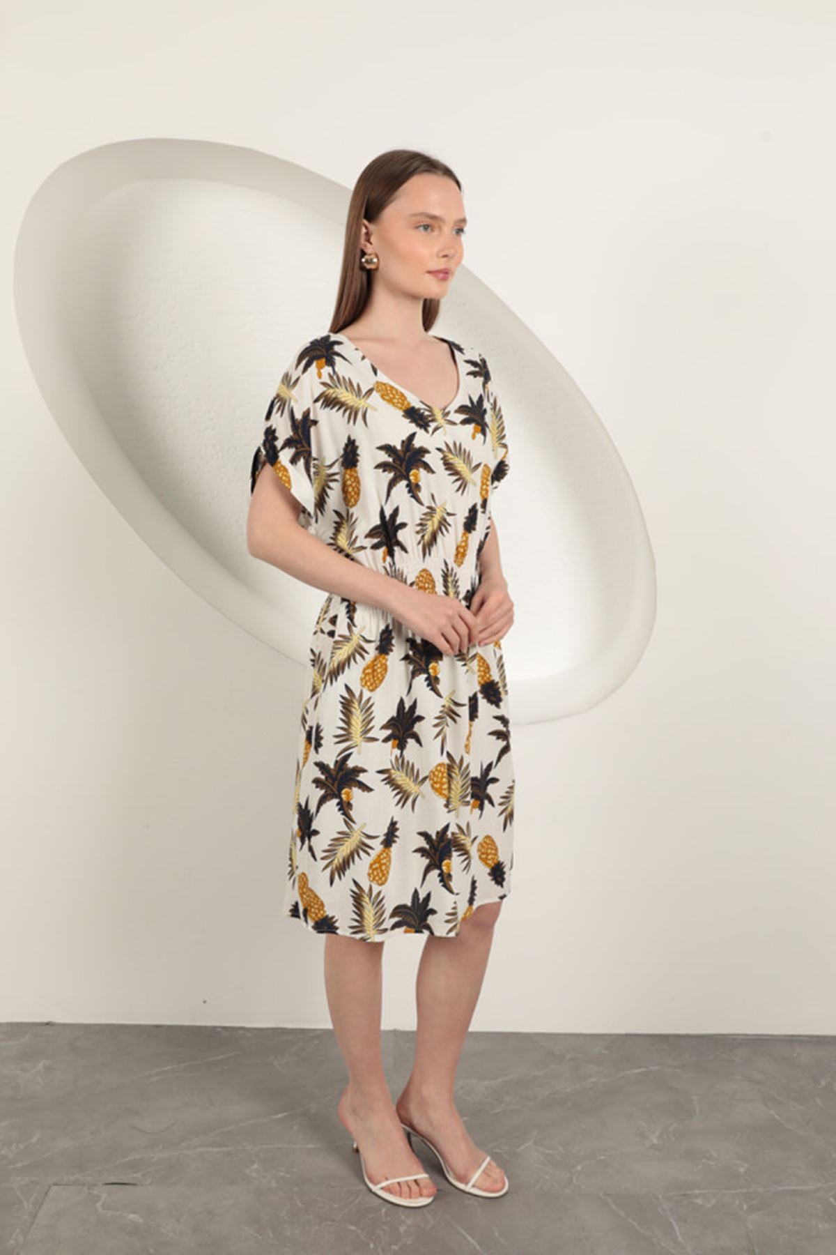 Viskon Ananas Desenli Elbise-Ekru