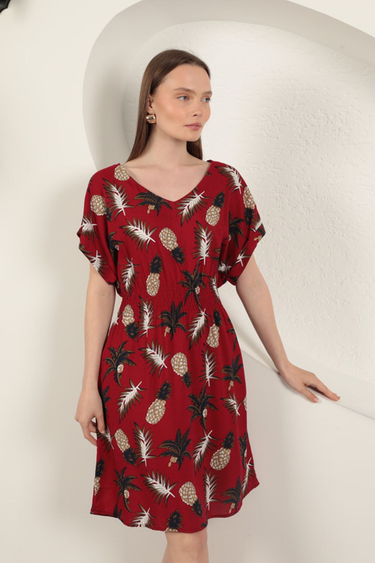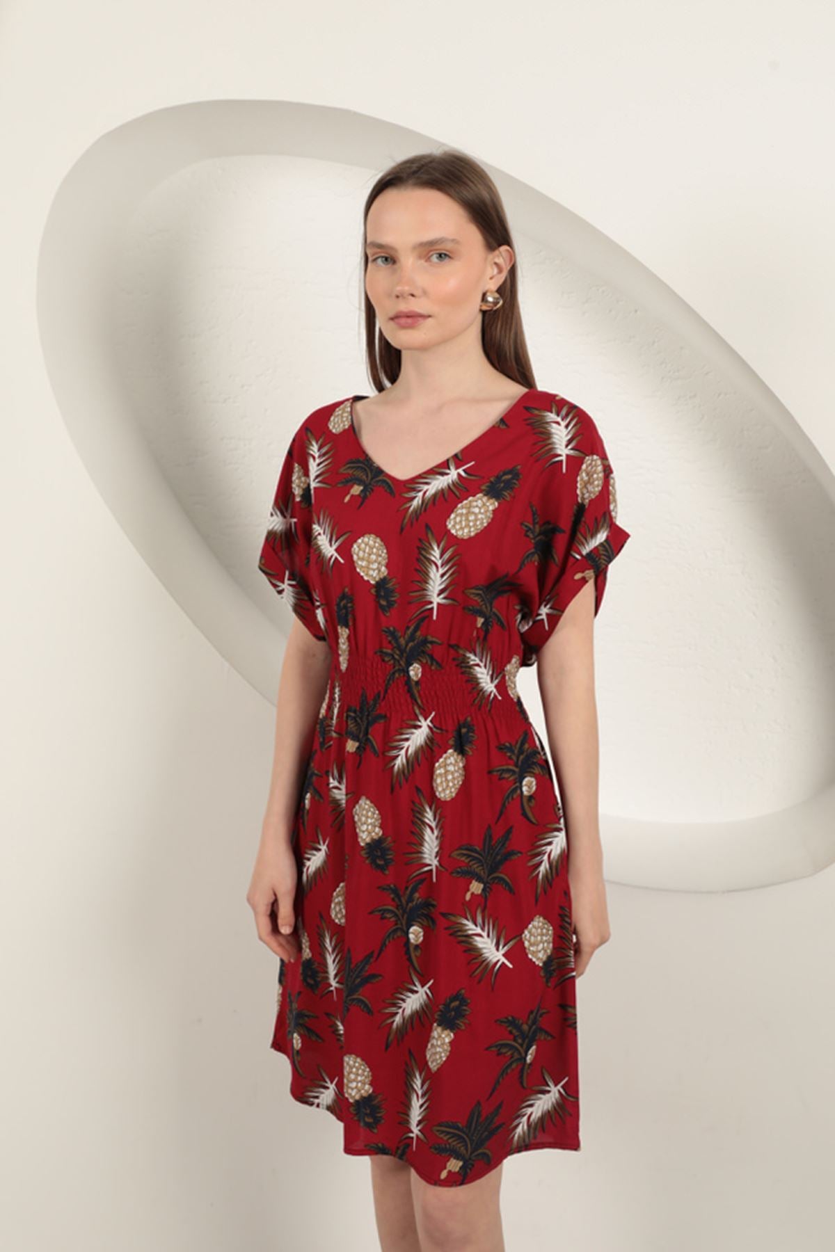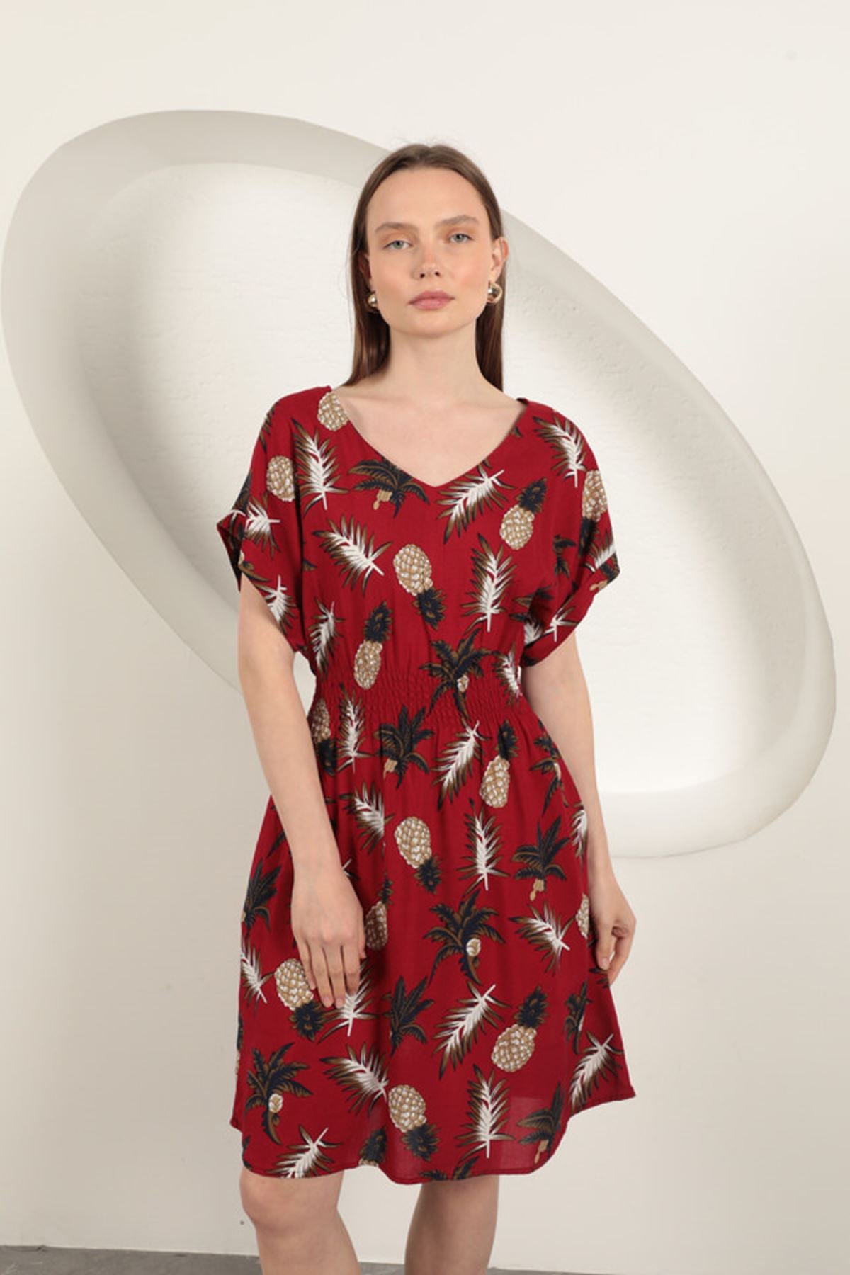 Diger84333Viskon Ananas Desenli Elbise-Kırmızı