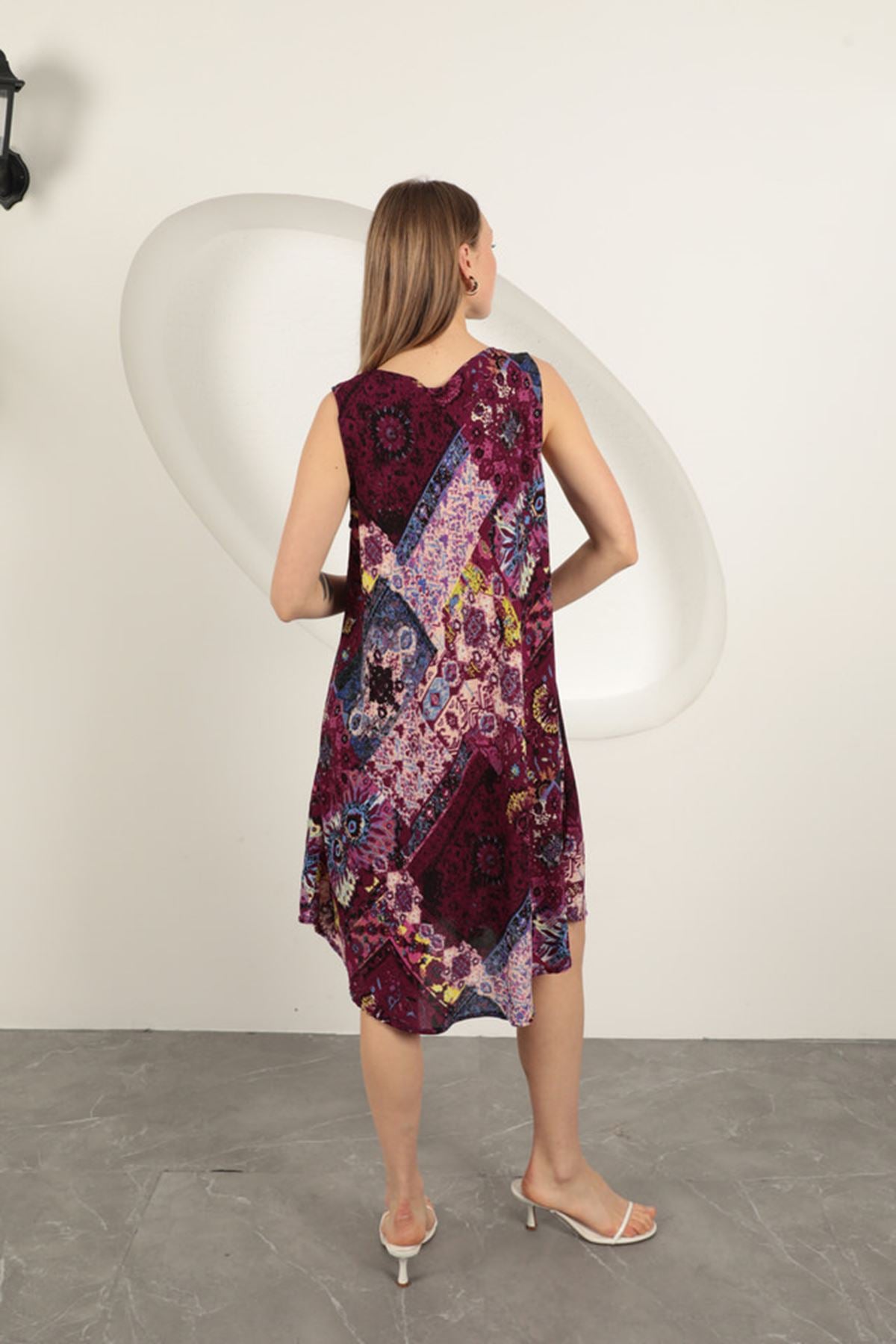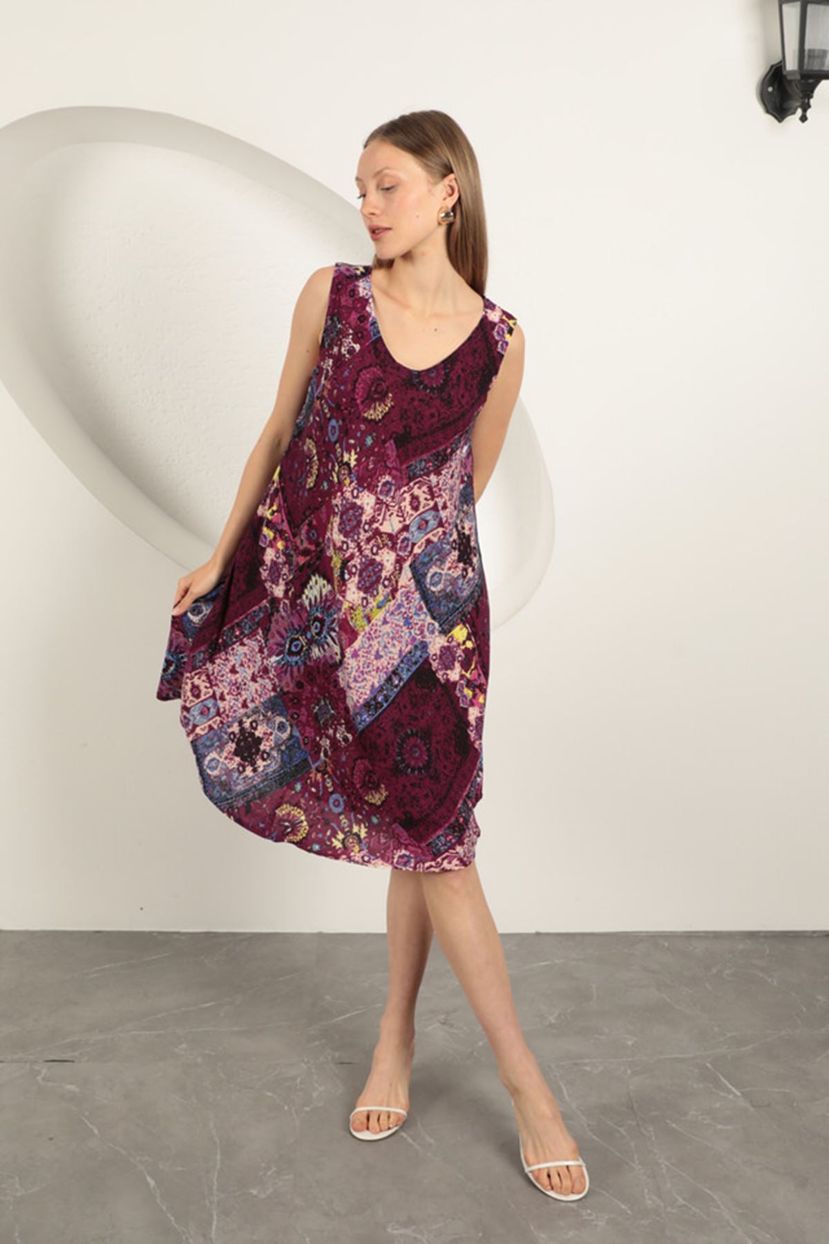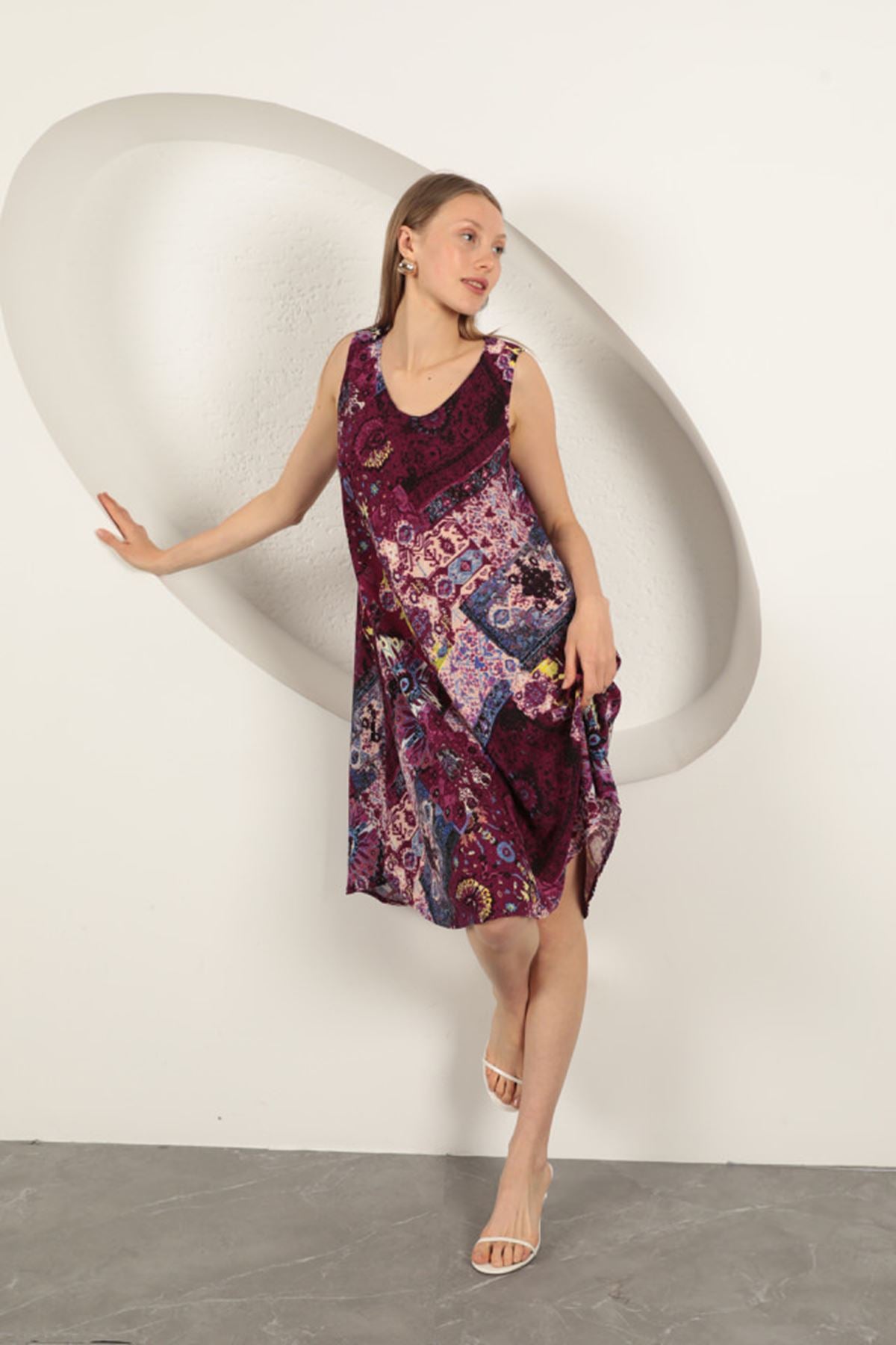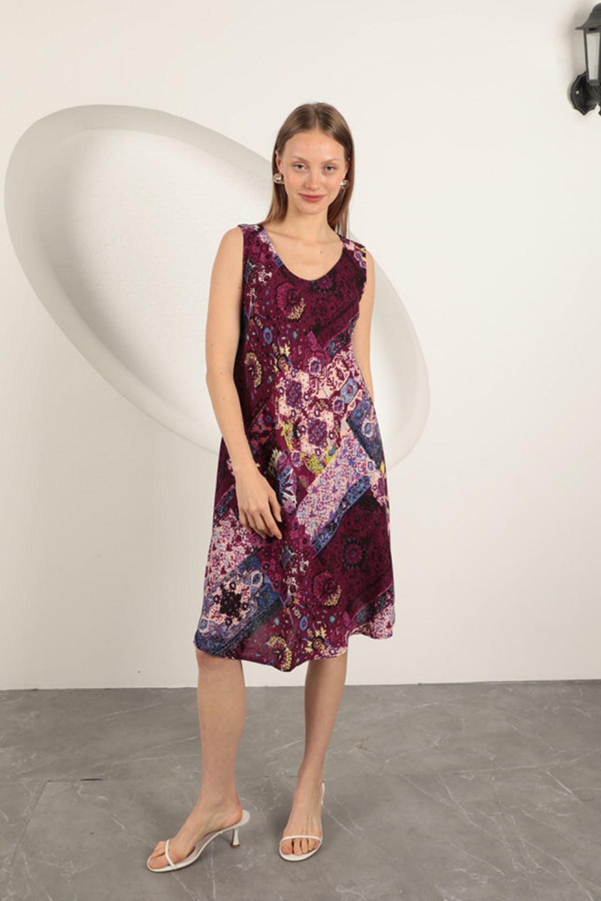 Viskon Kumaş Etnik Desenli Elbise-Mor