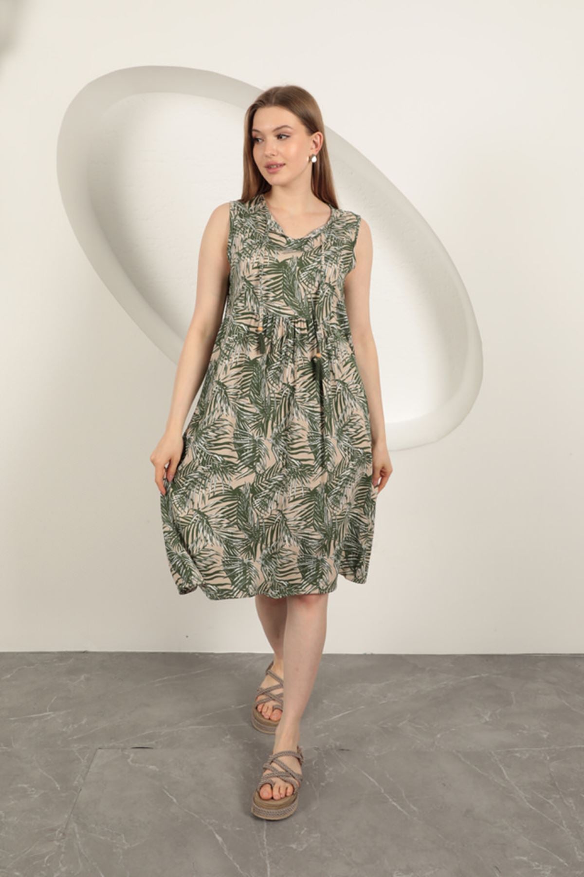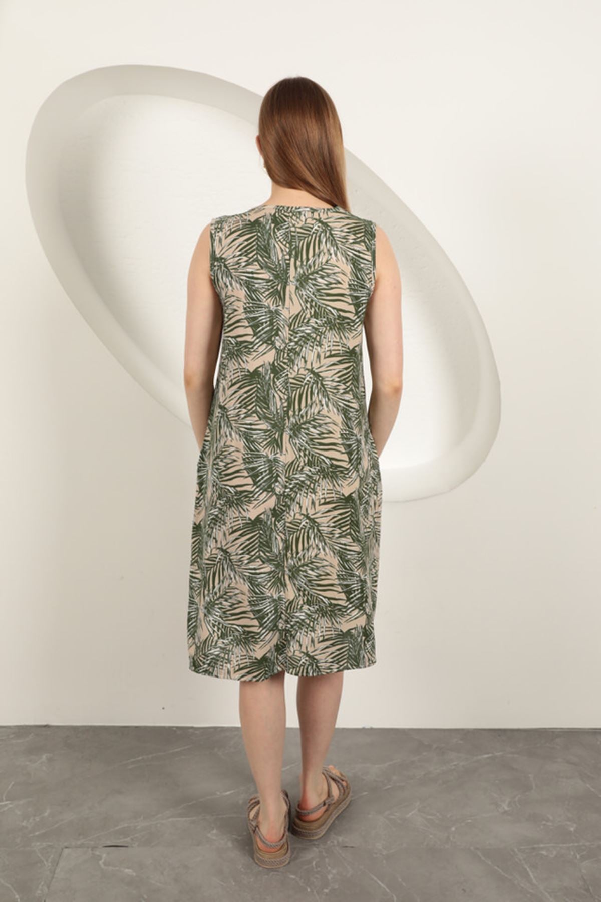 Diger82801Viskon Kumaş Palmiye Desen Elbise-Yeşil