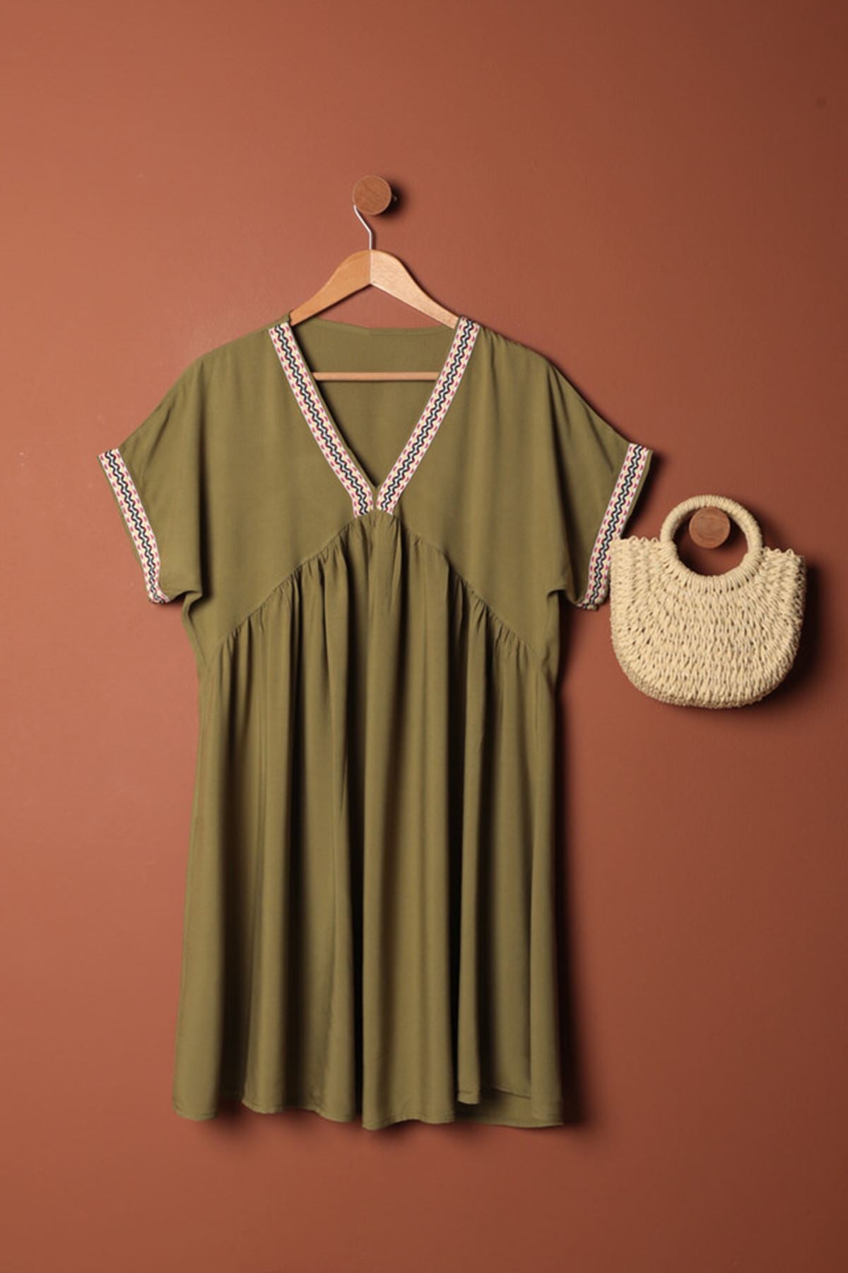 Viskon Kumaş Yakası Kolu Şerit Detaylı Elbise-Haki
