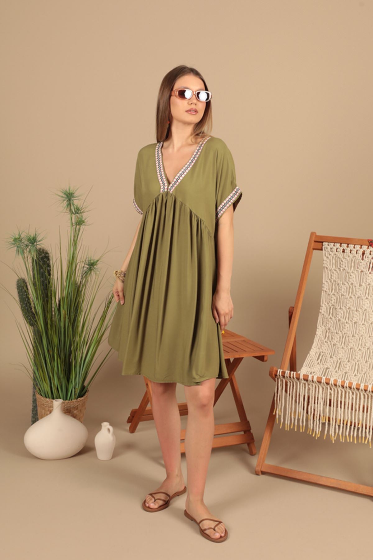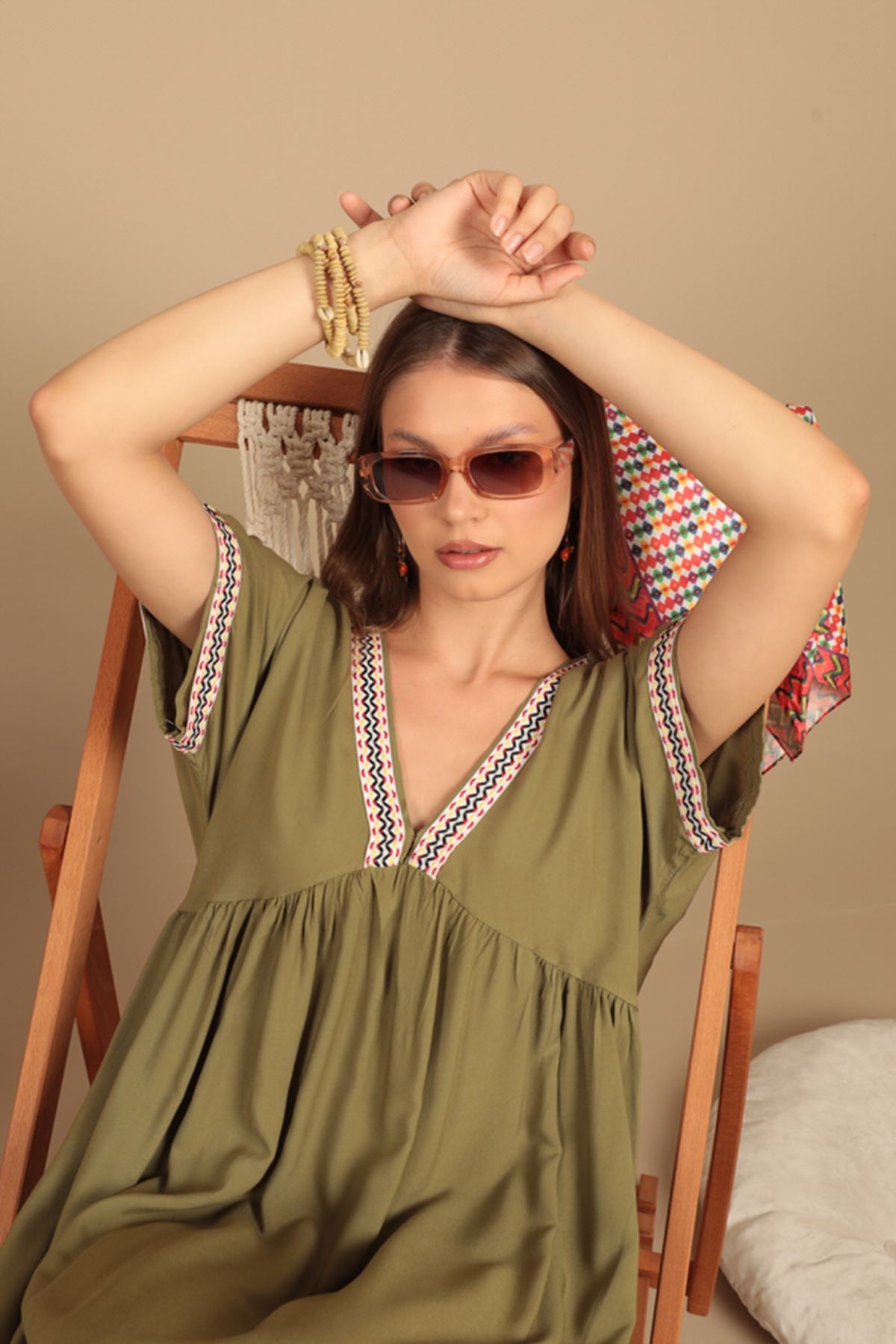 Diger85164Viskon Kumaş Yakası Kolu Şerit Detaylı Elbise-Haki